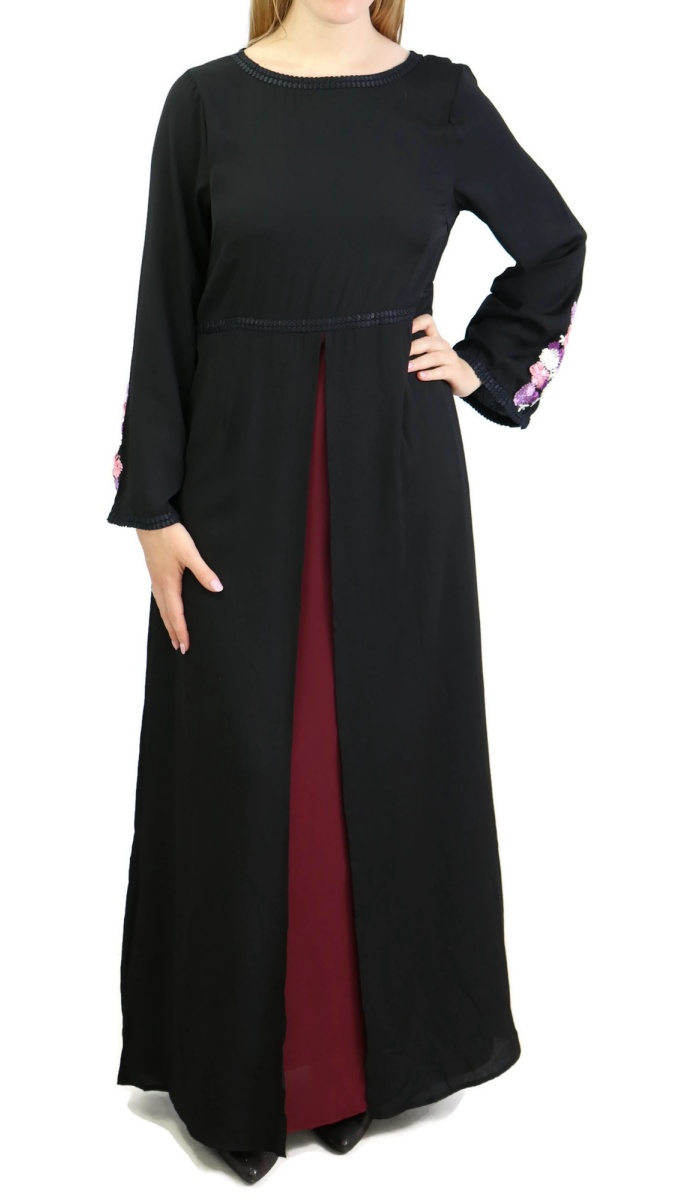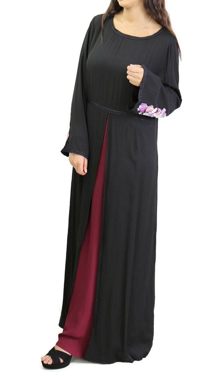 Très belle robe longue noire et bordeaux cousue en une seule pièce avec jolies broderies de fleurs multicolor sur les manches. Broderies noires discrètes sur le ventre.