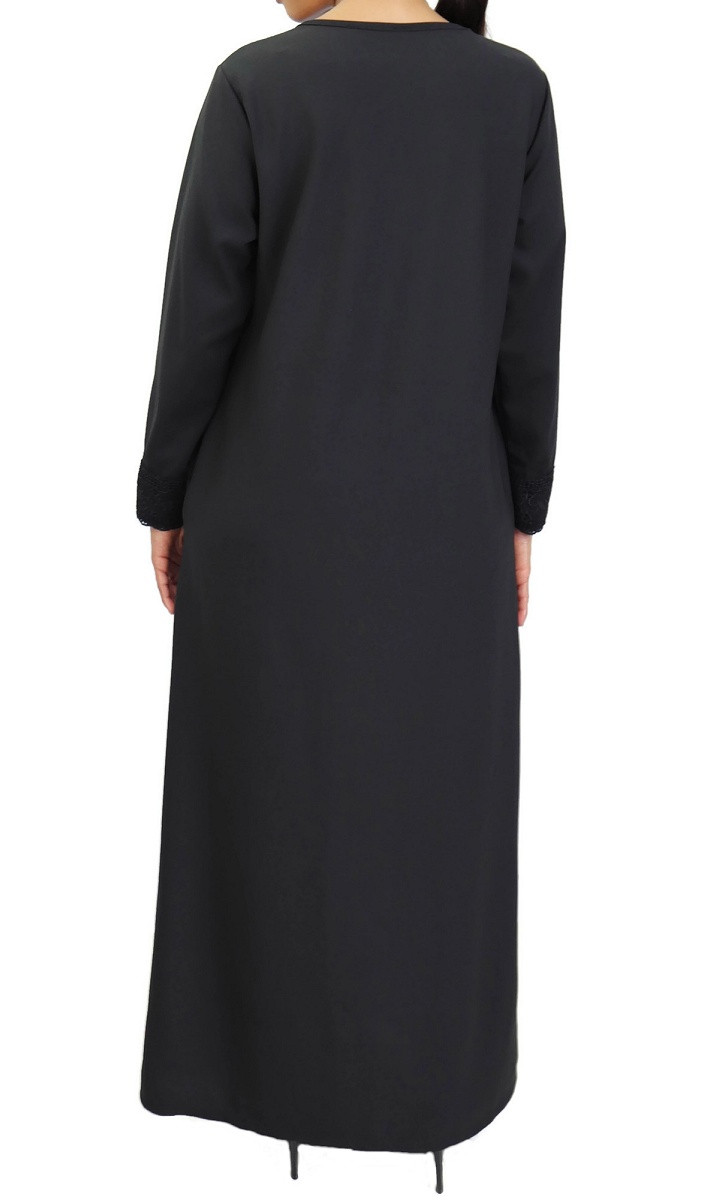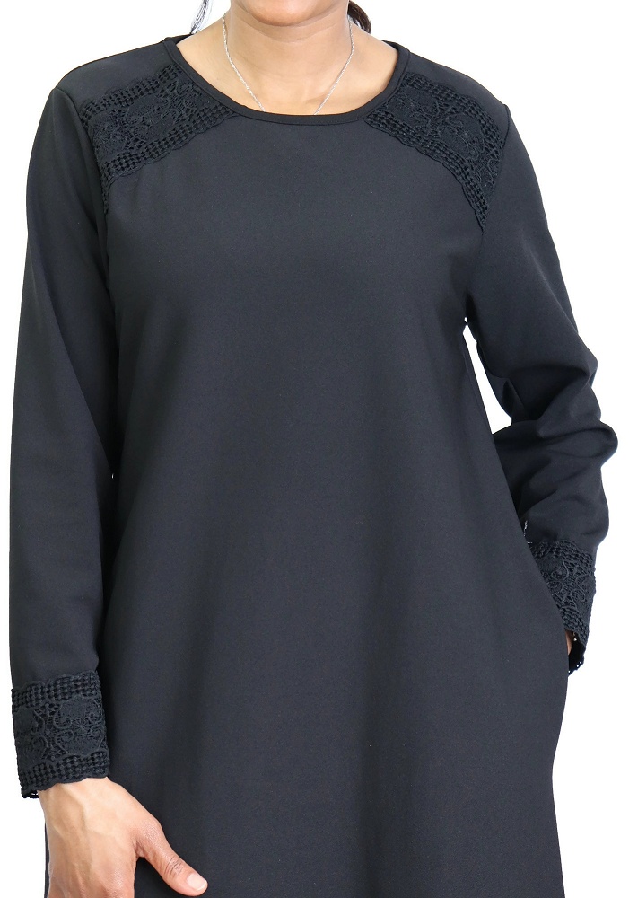 Belle robe sobre et discrète ornée de broderies sur les épaules et les poignets, col rond, poches latérales très pratiques, tissu opaque et léger.
