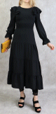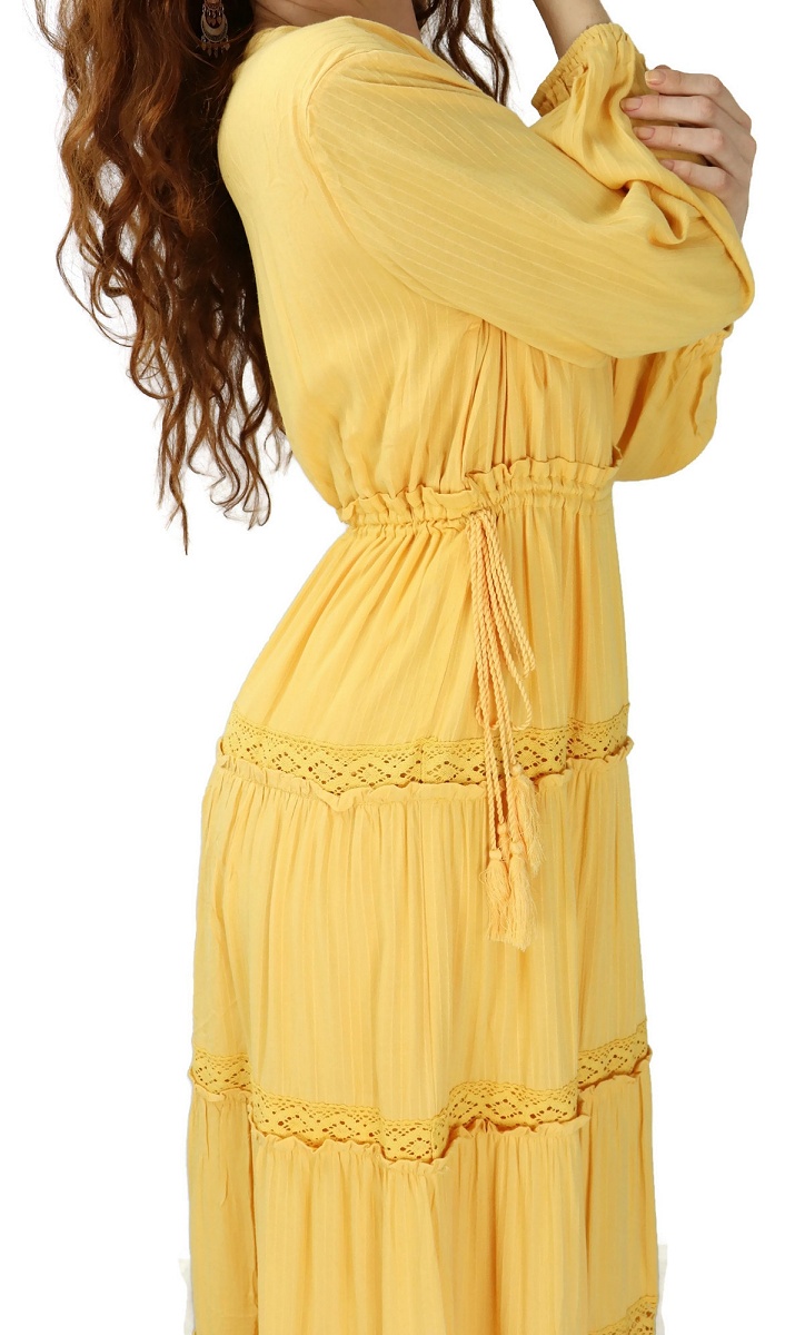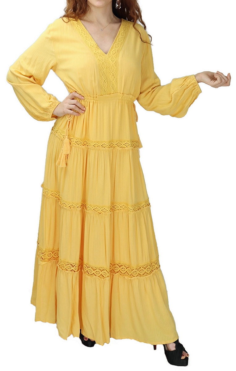 Robe longue bohème chic entièrement doublée (sauf aux manches), col en V brodé ainsi que sur différentes parties, cordons des serrage à la taille, 3 volants dentelles coton.