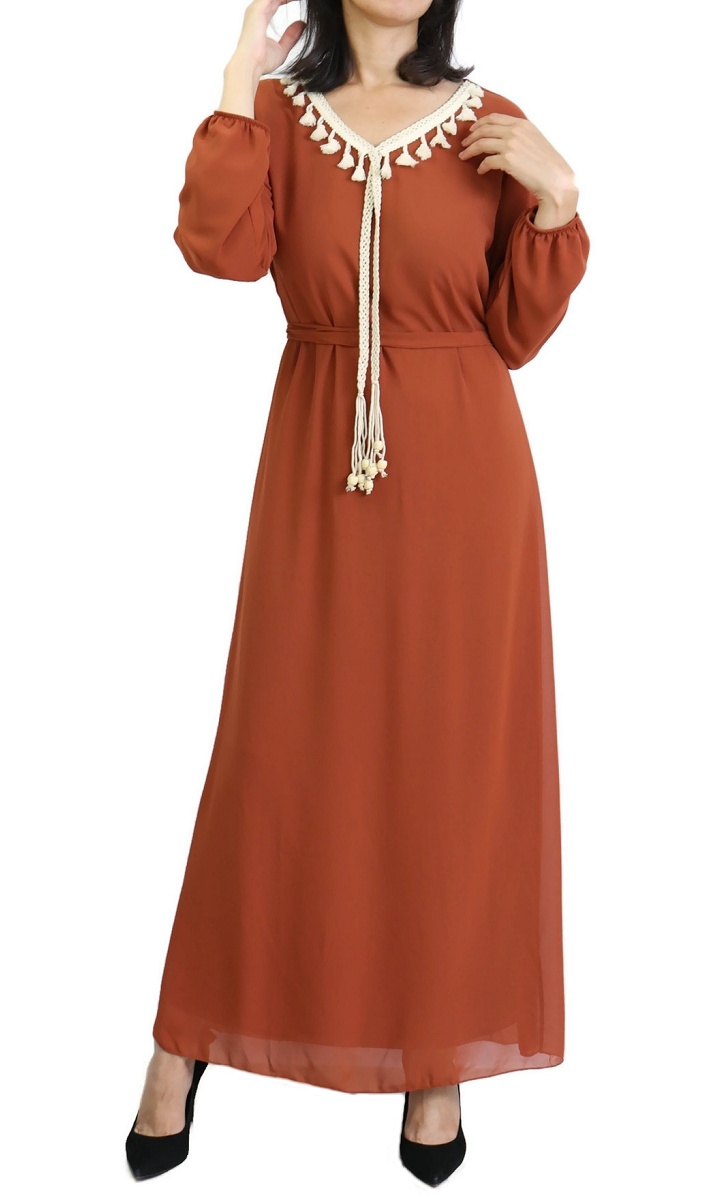 Robe col V entièrement doublée ornée de cordons beiges tressés, avec une jolie ceinture fine à nouer autour ou par derrière pour un effet cintré. Robe entièrement doublée. Tissu de type mousseline.