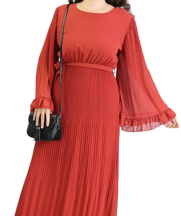 Robe longue ajustable à la taille. Plissée en bas de la robe ainsi que sur les manches évasées, le tout accompagné d'une ceinture qui peut se mettre autour ou par derrière. Intérieur doublé. Tissu de type mousseline.
