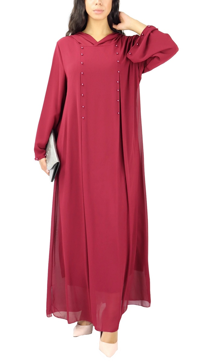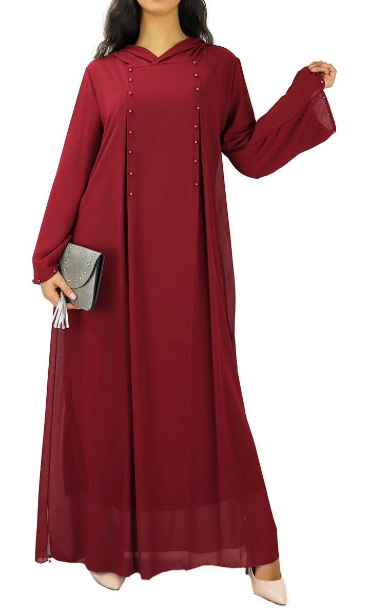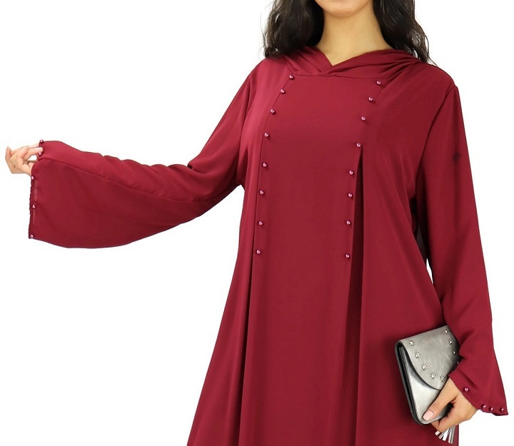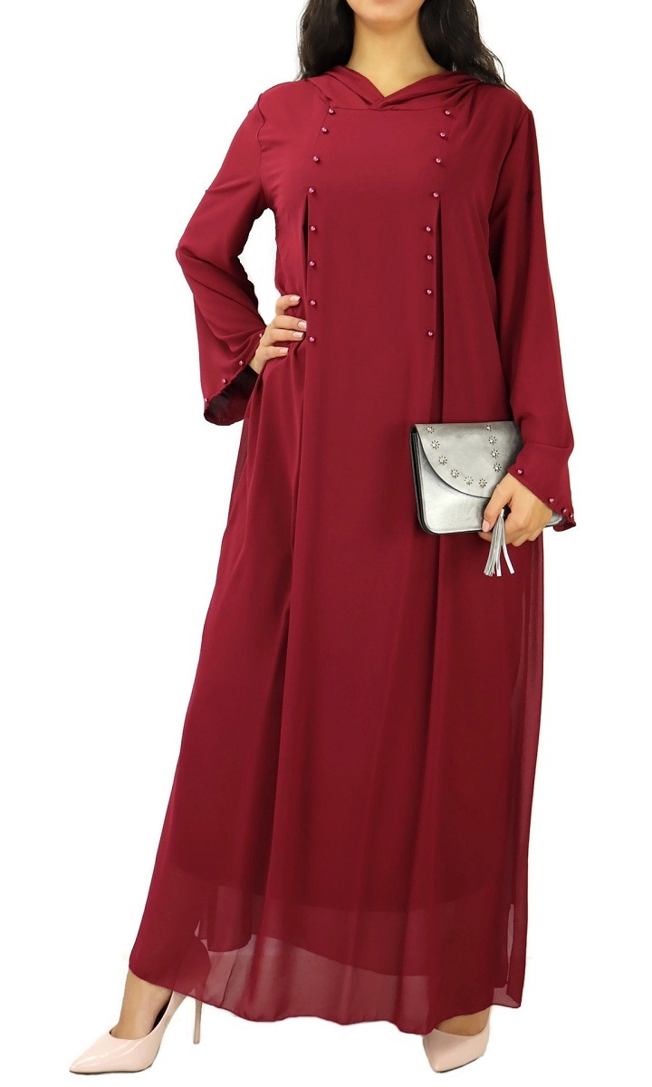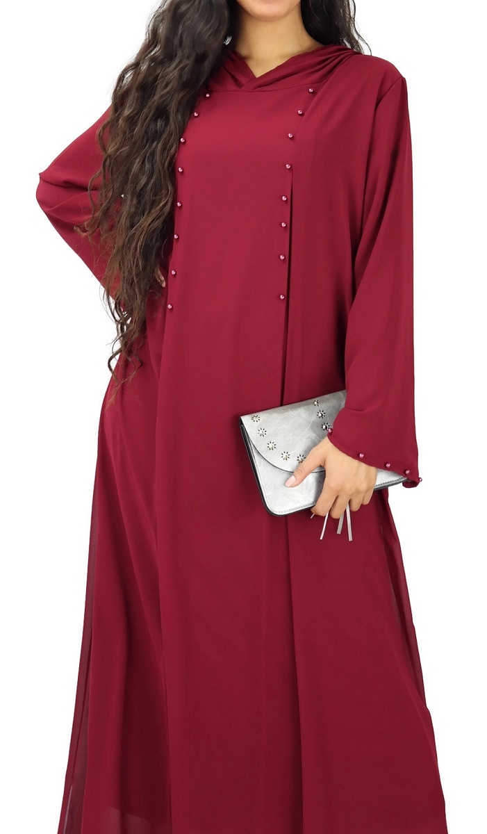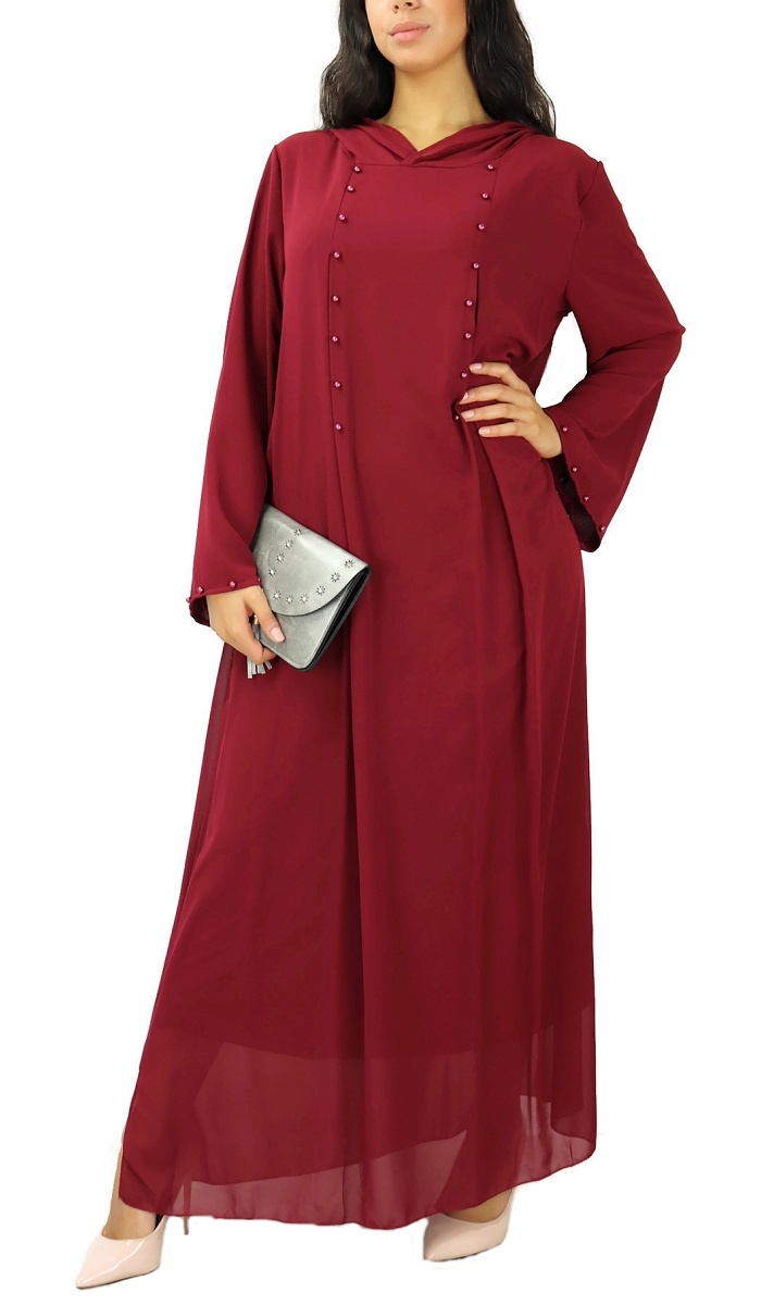 Robe longue, col capuche, entièrement doublée, manches longues, orné des perles sur le devant ainsi que les poignets. Sobre et élégant, Cette tenue s’accommode pour diverses occasions aussi bien festives que quotidiennes.