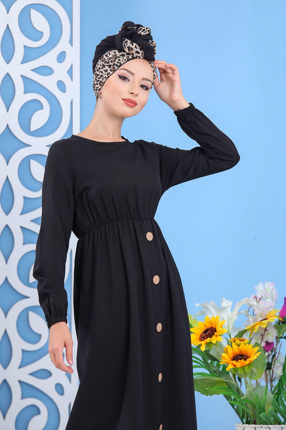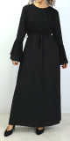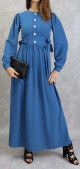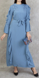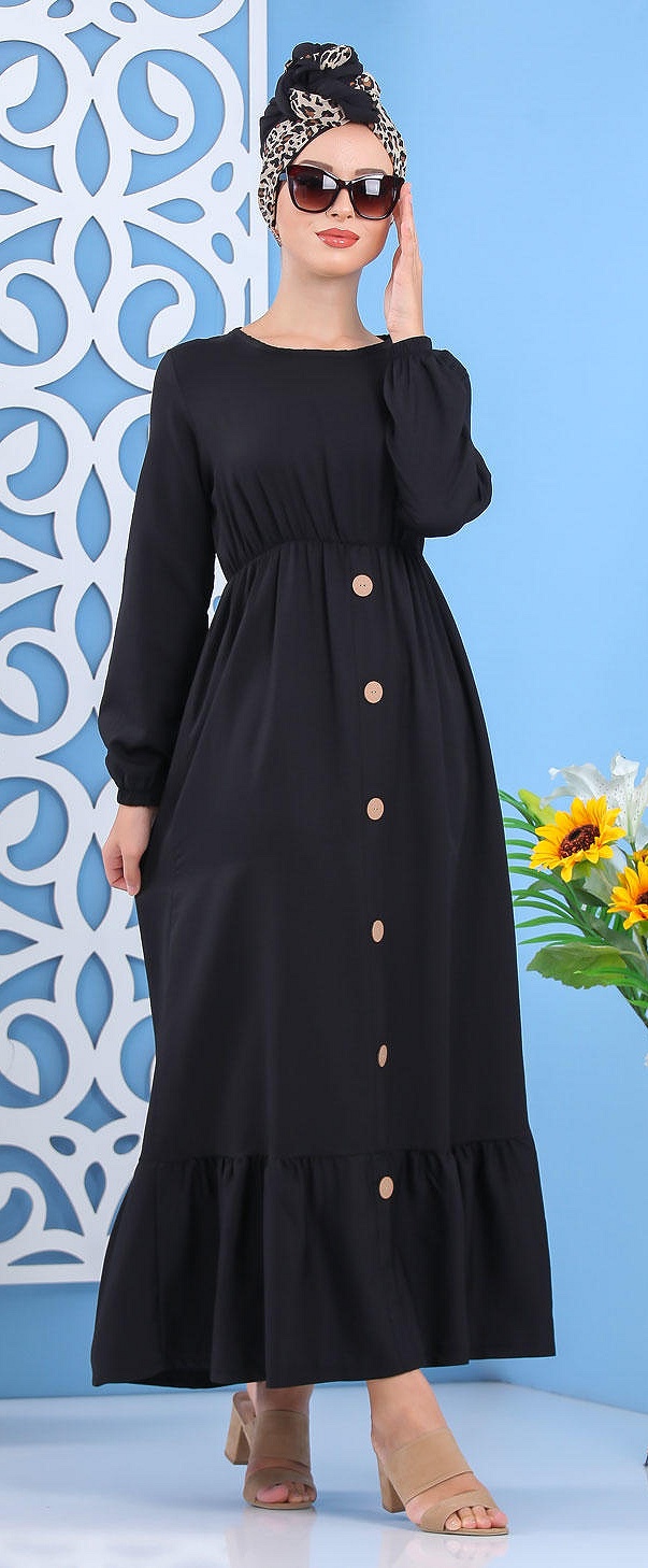 Robe longue, col arrondi, manches finition élastiques aux poignets, taille cintrée par un élastique, effet volant sur la partie basse. Sobre et élégant, ce modèle est adapté pour être porté quotidiennement, il sera encore plus mis en valeur avec quelques accessoires.