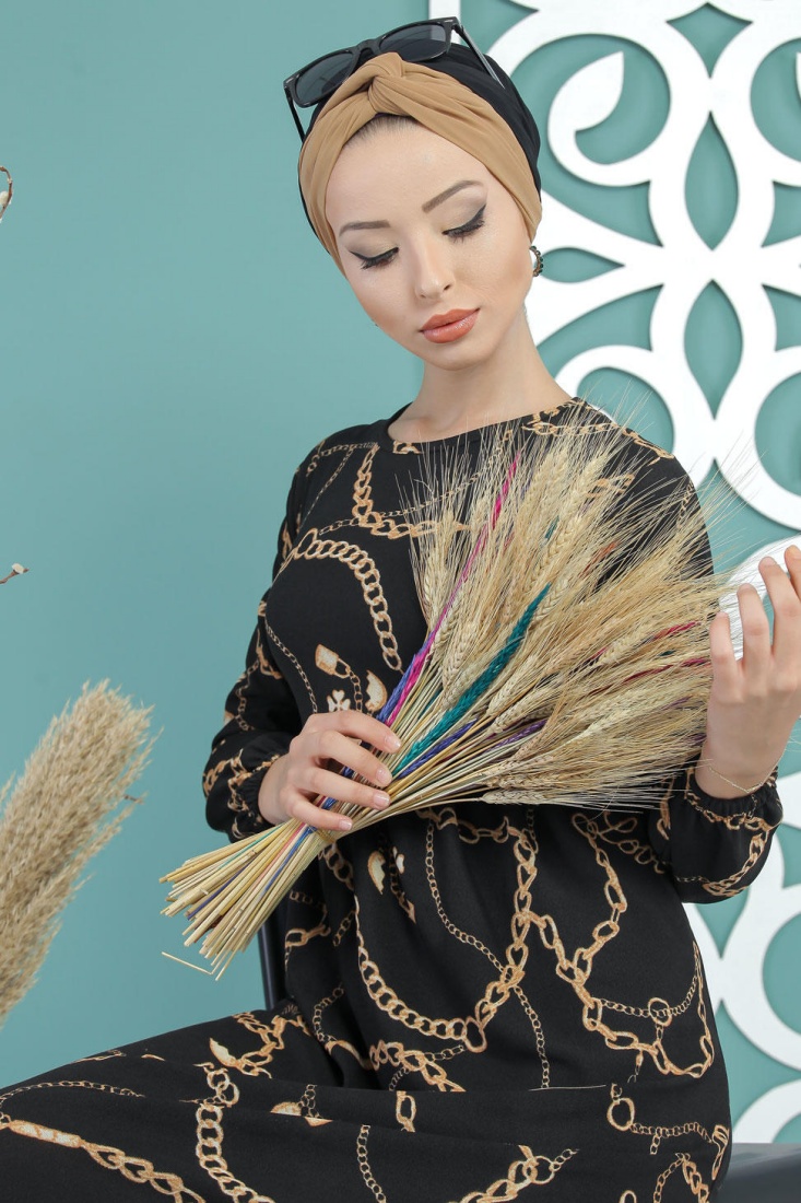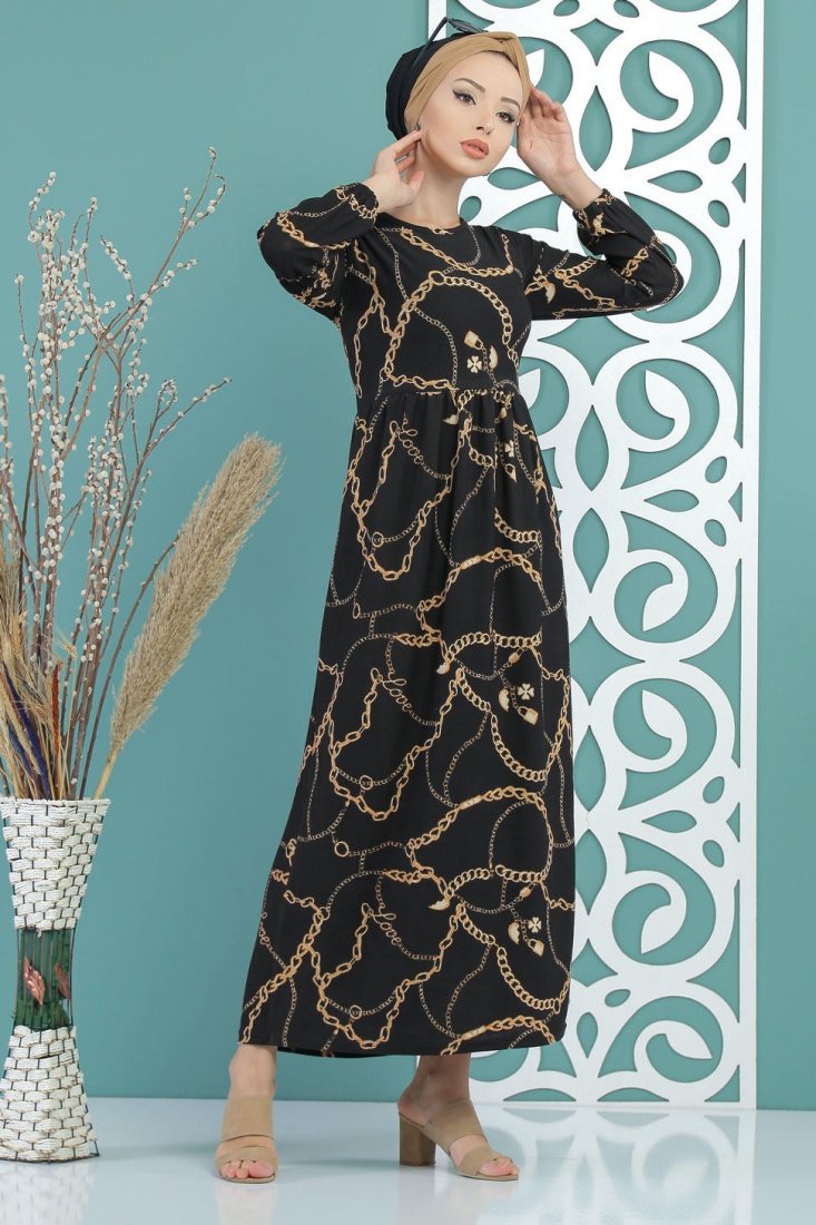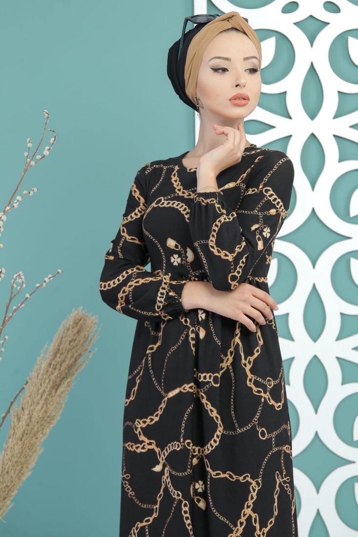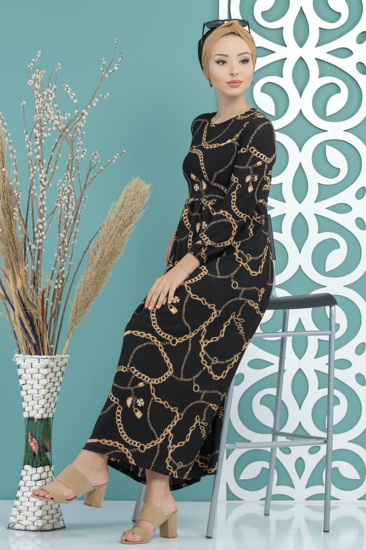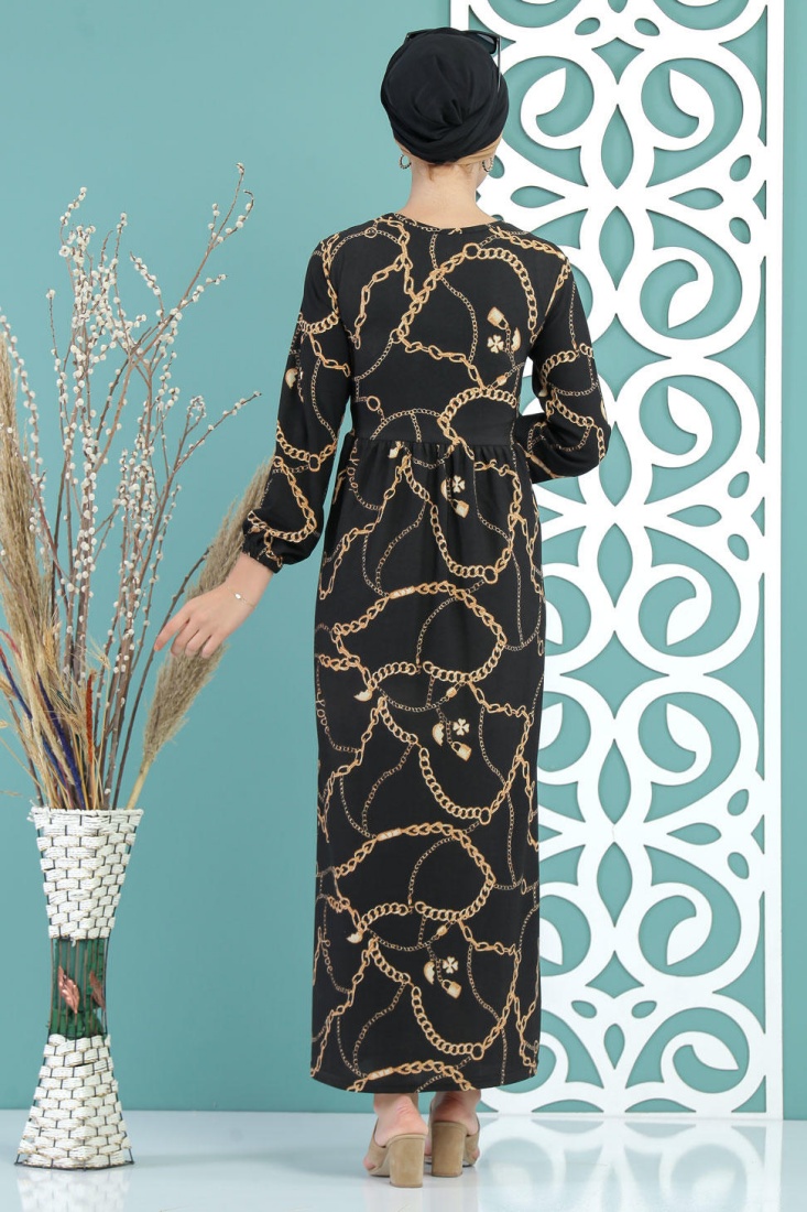 Robe longue, col rond, manches finition élastiques aux poignets, taille froncée élastique, tissu crêpe fluide. Cette robe à imprimés "chaines", très tendance, vous permettra de sortir du commun. Vous pourrez la porter aussi bien en journée qu'en soirée.