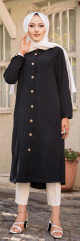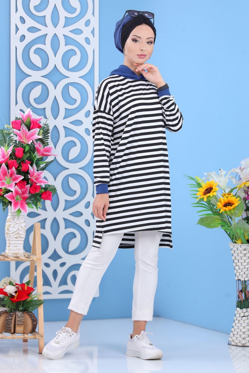 Tunique à rayures noires et blanches longue derrière légèrement courte devant, manches longues, capuche et poignée de même couleurs, coupe droite, tissu léger. Ce modèle est adapté pour les 4 saisons, sa coupe décontractée vous permettra de le porter quotidiennement.