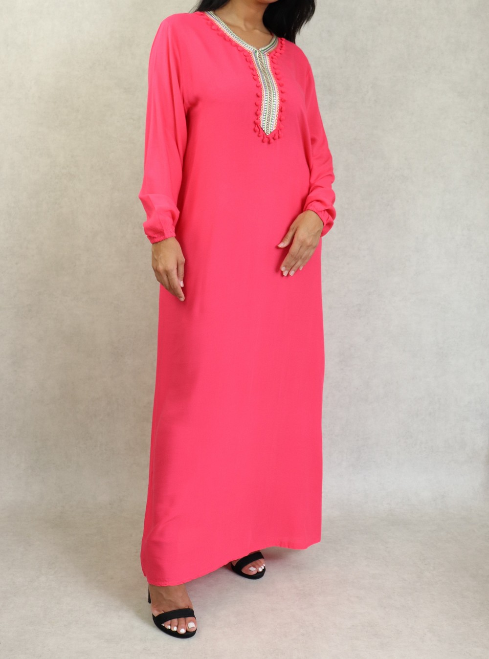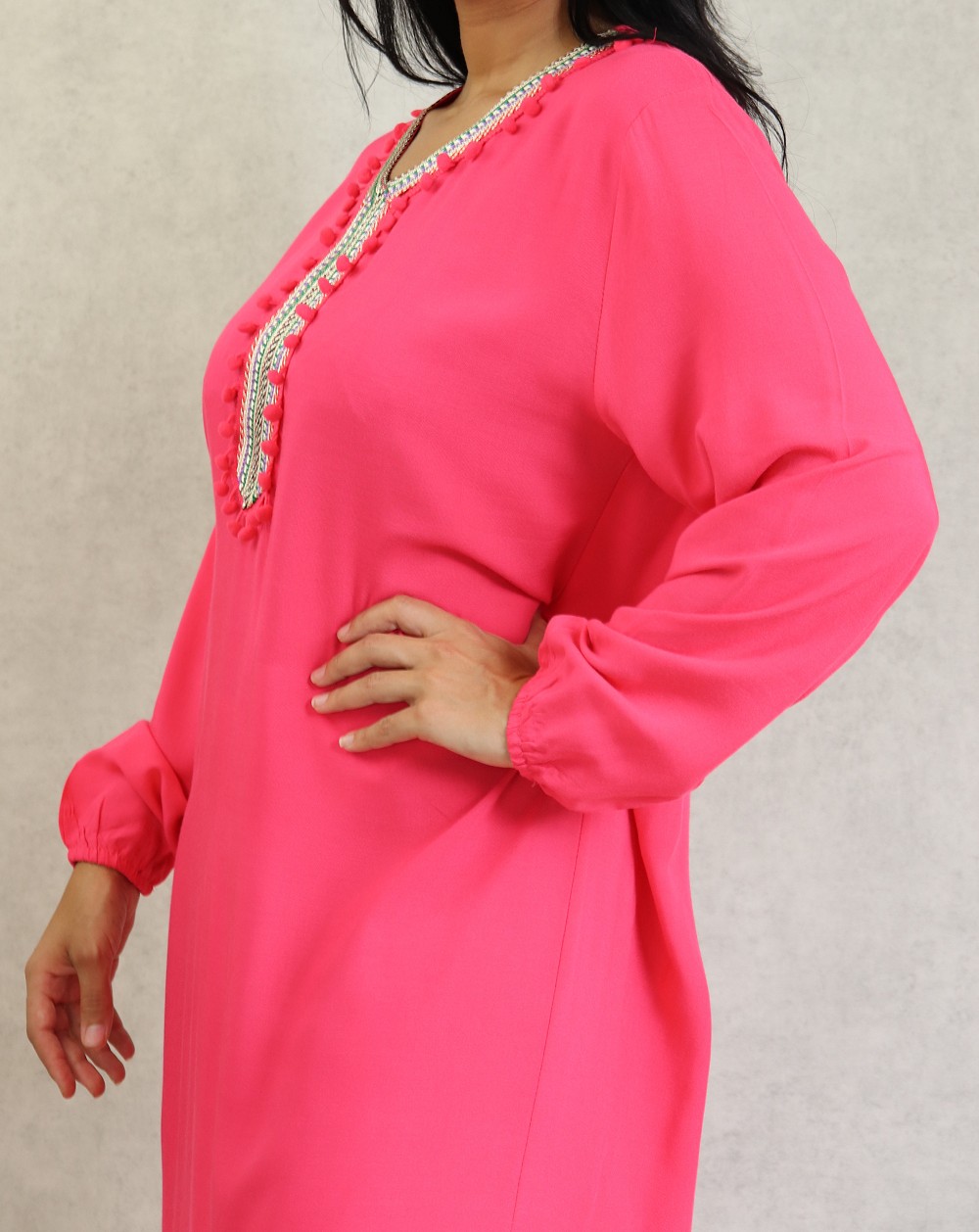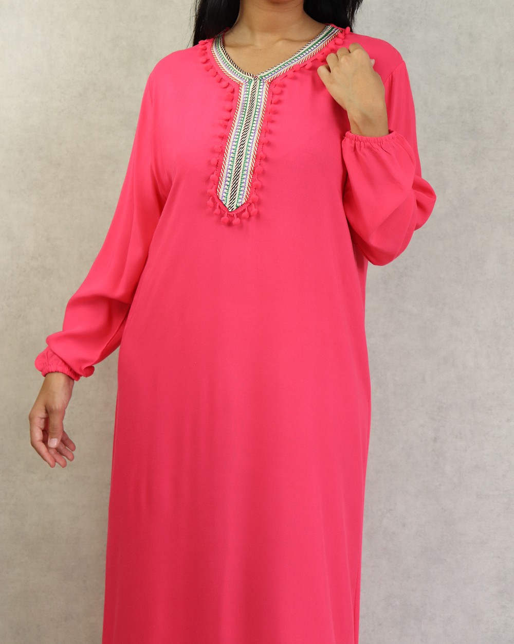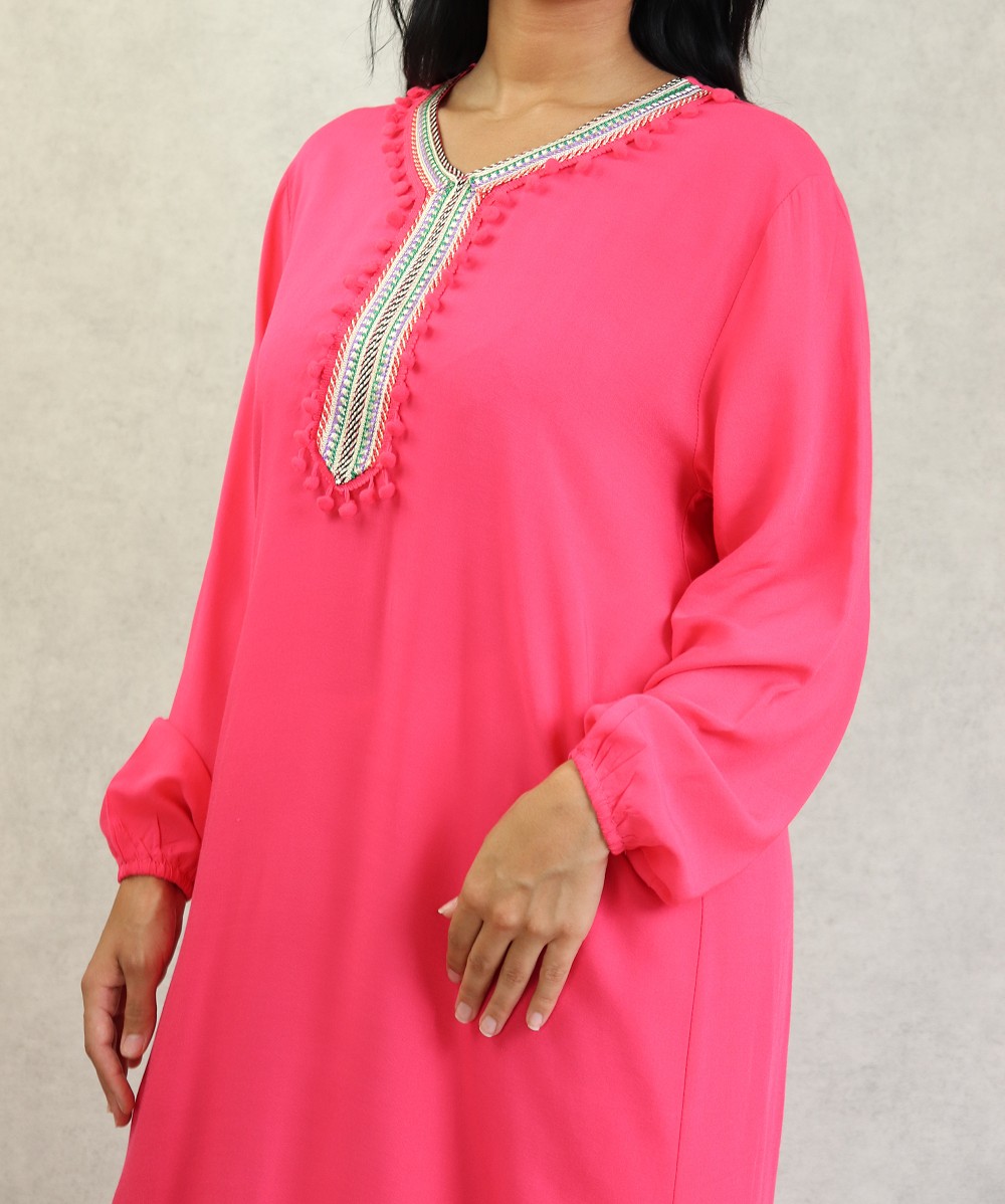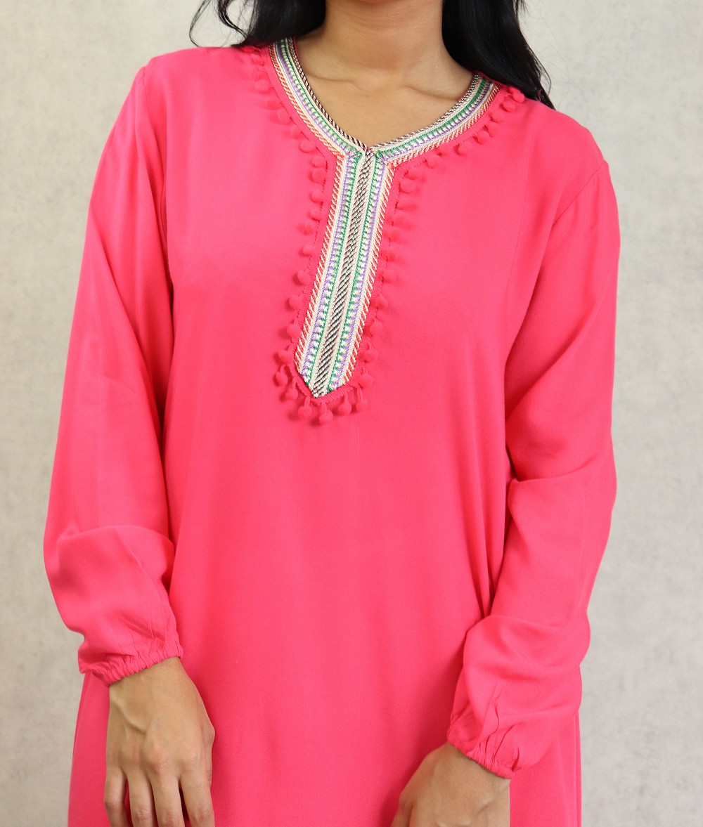 Robe d’été fluide et légère de couleur unie. Manches longues finition élastiques aux poignets. broderie multi couleur au niveau de col en V et le buste. Petits pompons sur le devant.