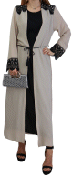 Robe longue, col en V, manches finition élastiques, ceinture à passants ajustable, entièrement doublée, coupe droite.