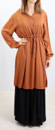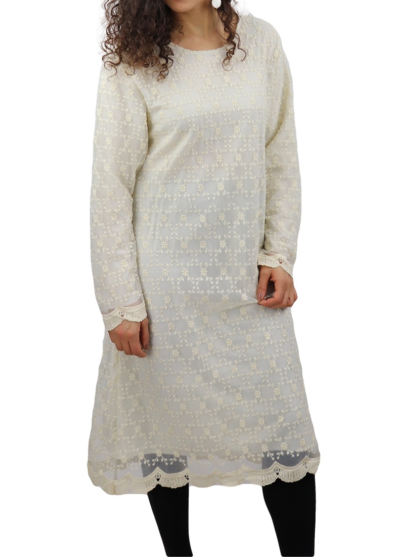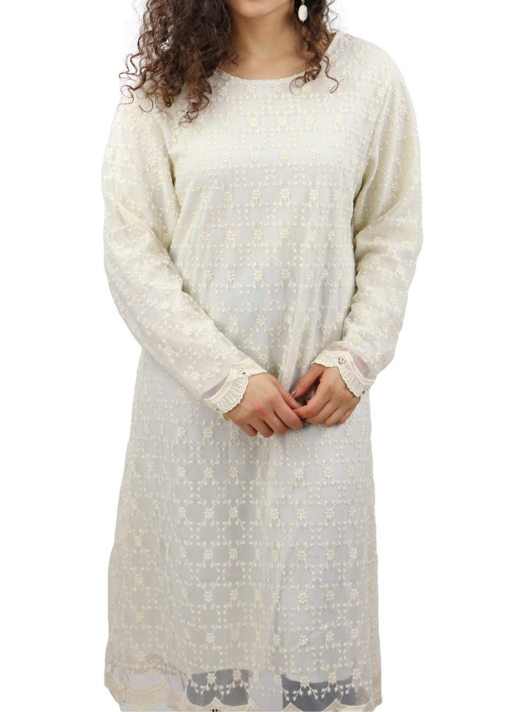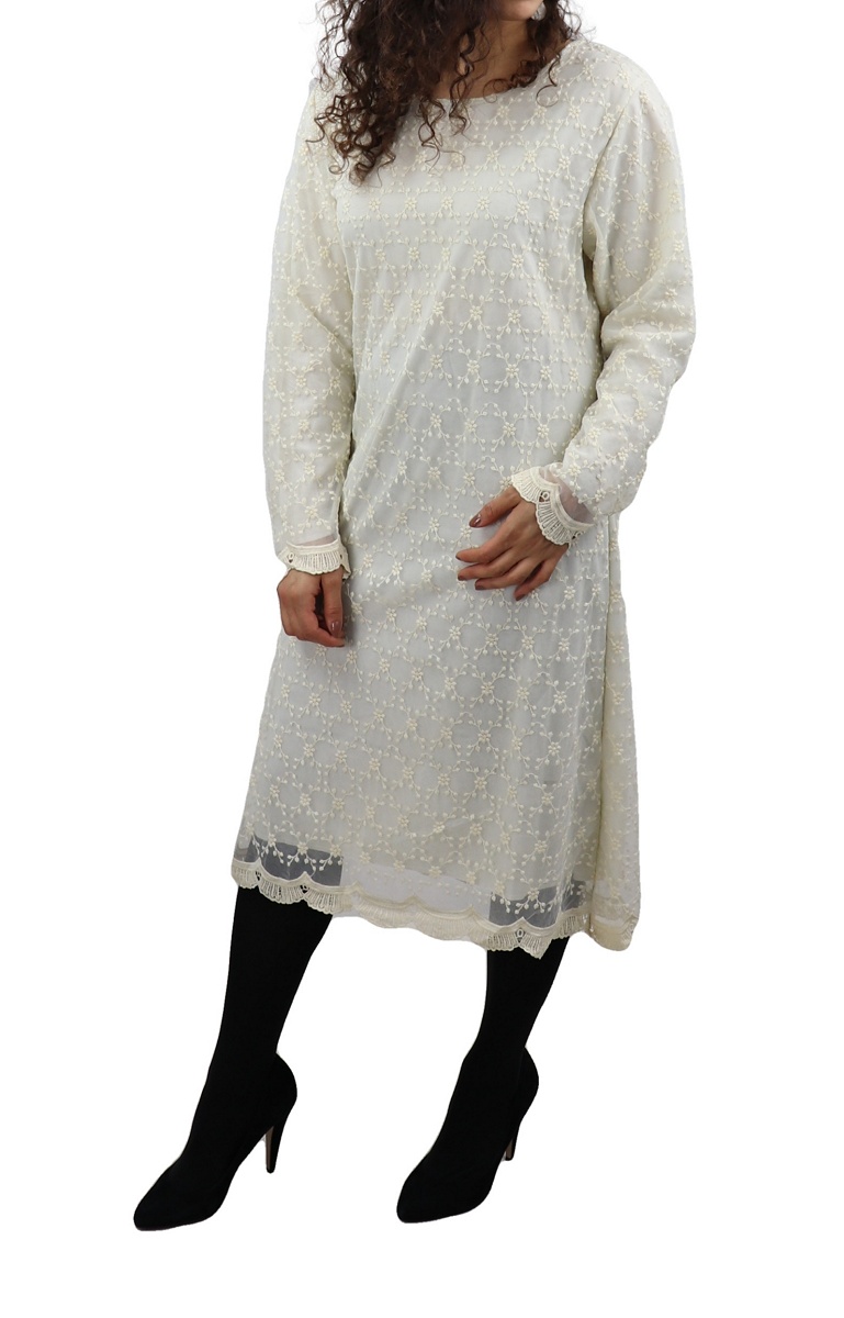 Tunique longue, col arrondi, fermeture bouton à l'arrière, entièrement doublée, coupe droite, finition broderies sur les manches et le bas.