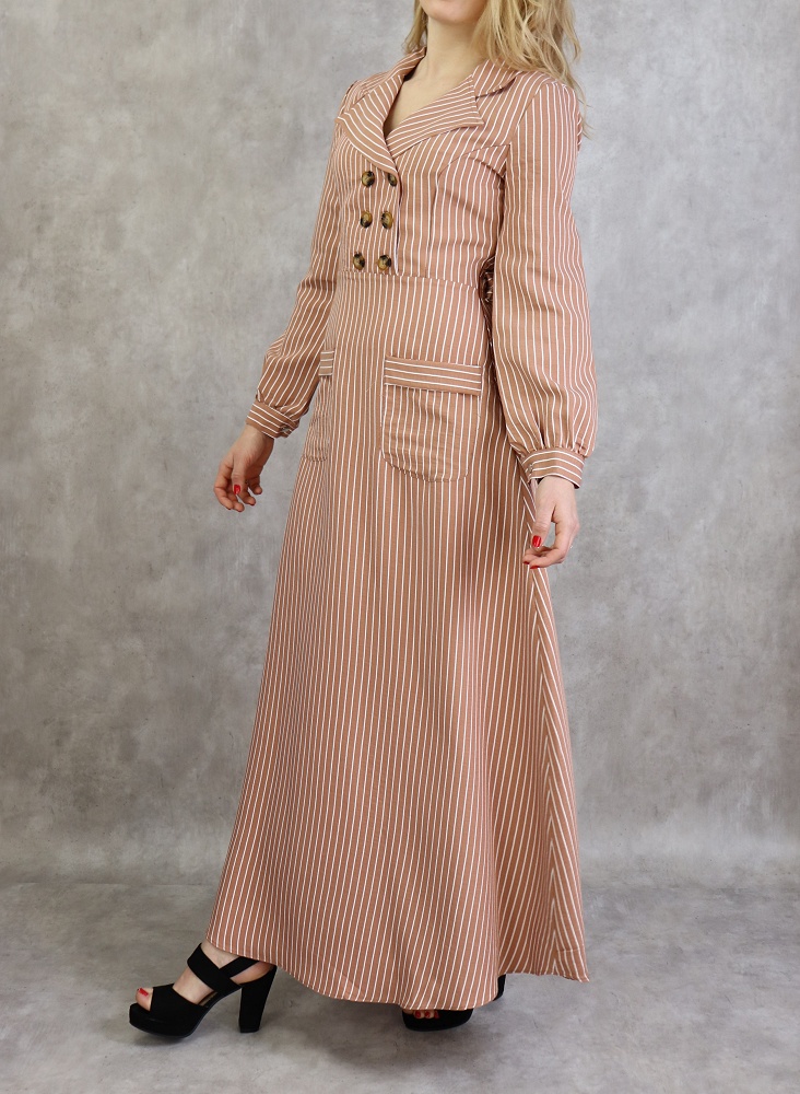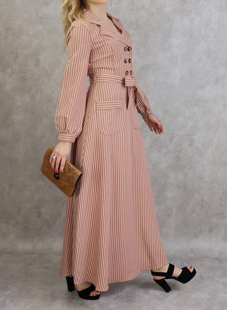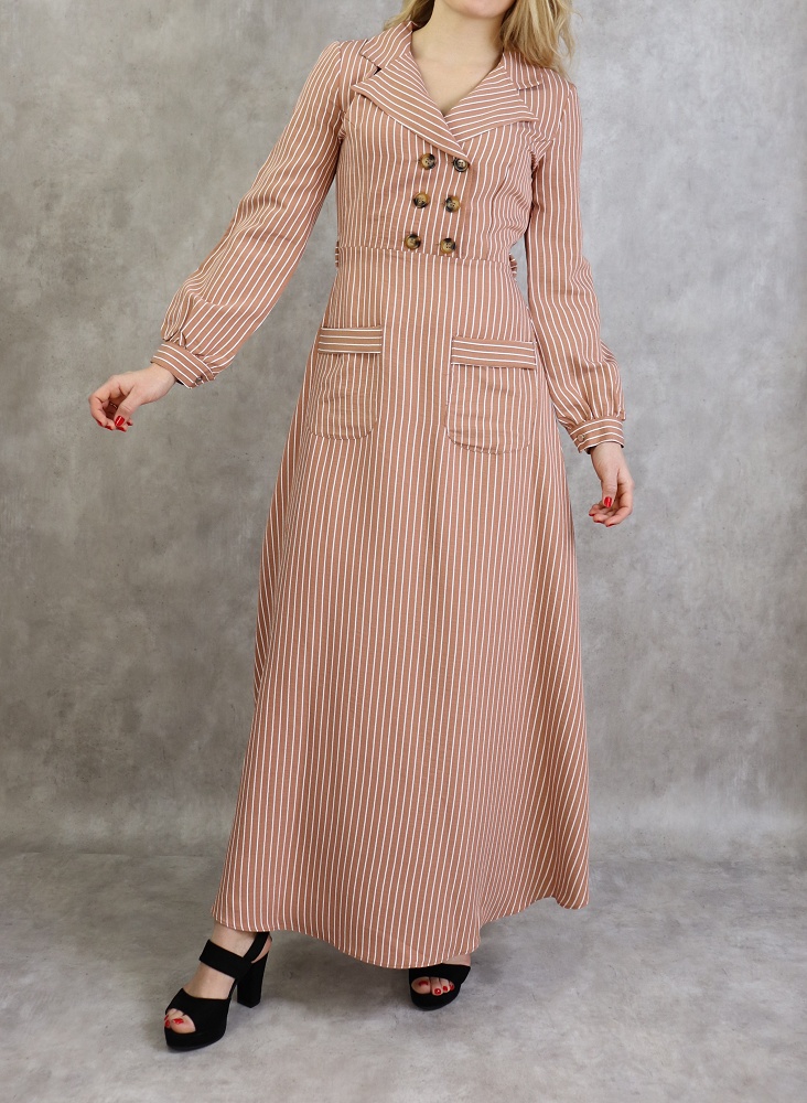 Cette robe rivalise d'élégance et d'originalité avec son double boutonnage et son imprimé à rayures, à vous de l'adopter.
