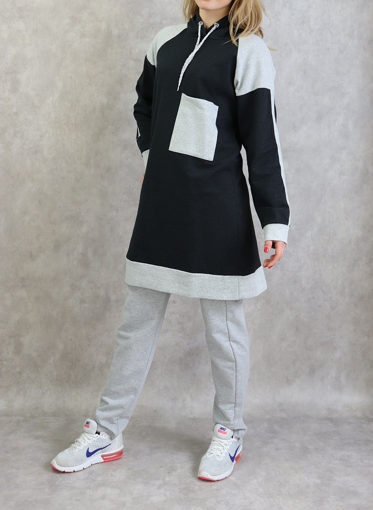 Ensemble survêtement 2 pièces. Sweat : mi long, capuche avec liens de serrage, coupe droite, poche plaquée. pantalon : coupe droite, taille élastique.