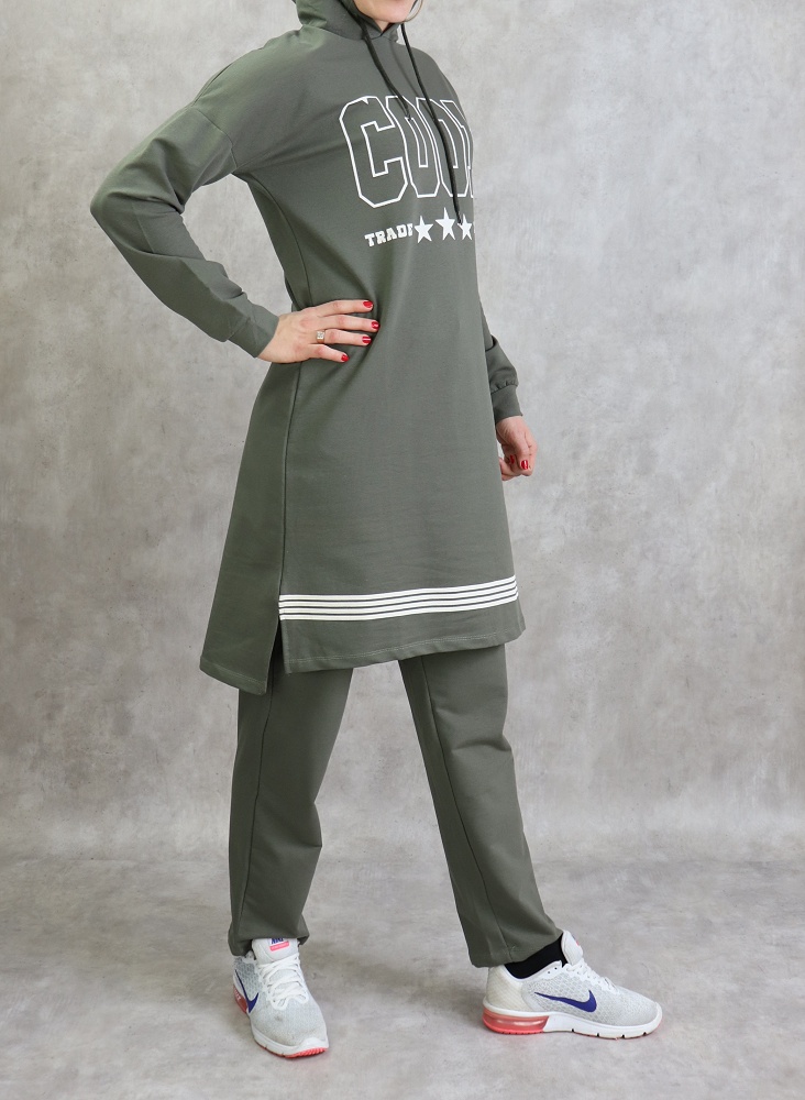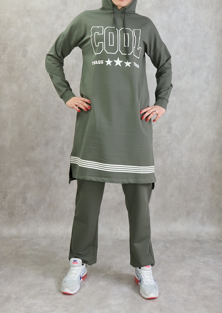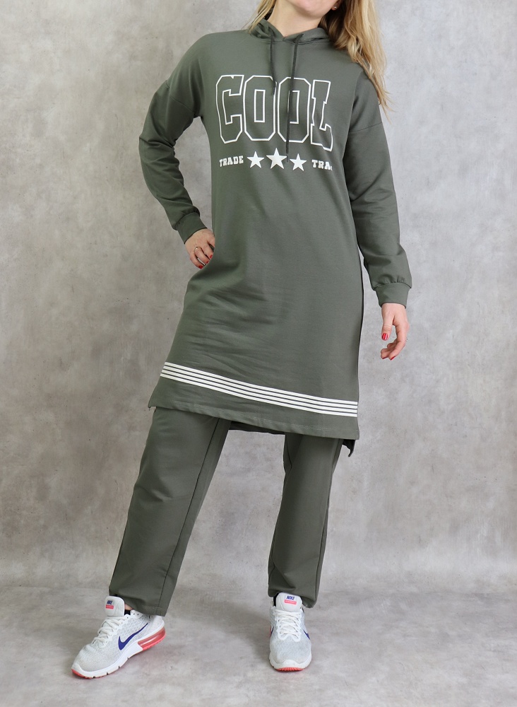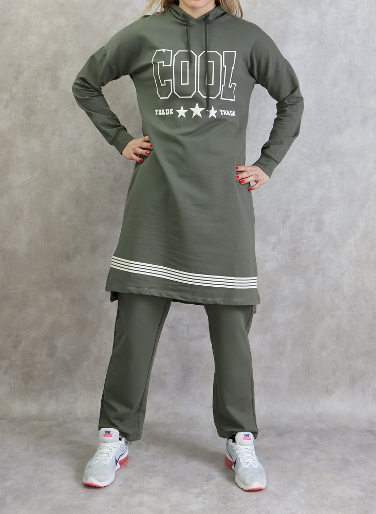 Survêtement 2 pièces. Sweat : mi long, capuche avec liens de serrage, fentes sur les cotés, coupe droite, matière sweat. Pantalon : coupe droite, taille élastique.