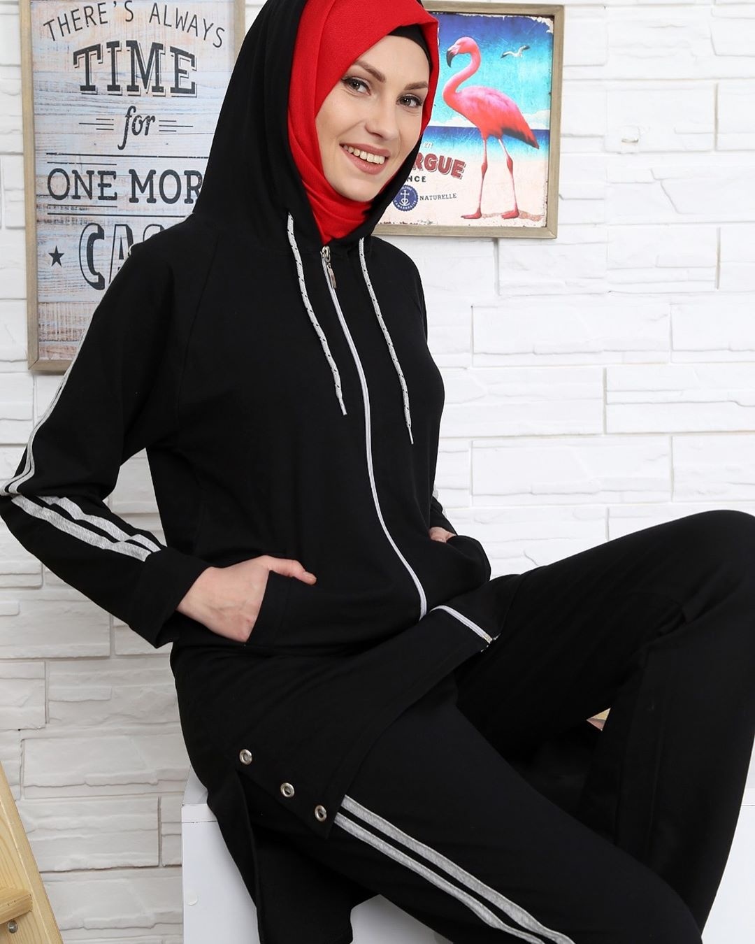Survêtement 2 pièces. Veste : mi-longue, capuche avec liens de serrage, 2 poches à l'avant, fermeture zippée, coupe droite, matière sweat, rivets de décoration sur les cotés. Pantalon : coupe droite, taille élastique.