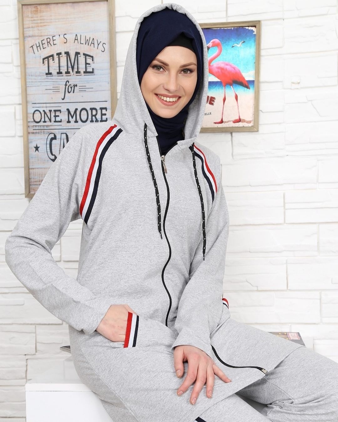 Survêtement 2 pièces. Veste : mi longue, capuche avec liens de serrage, fermeture zippée, 2 poches latérales, coupe droite, matière sweat. Pantalon : coupe droite, taille élastique.