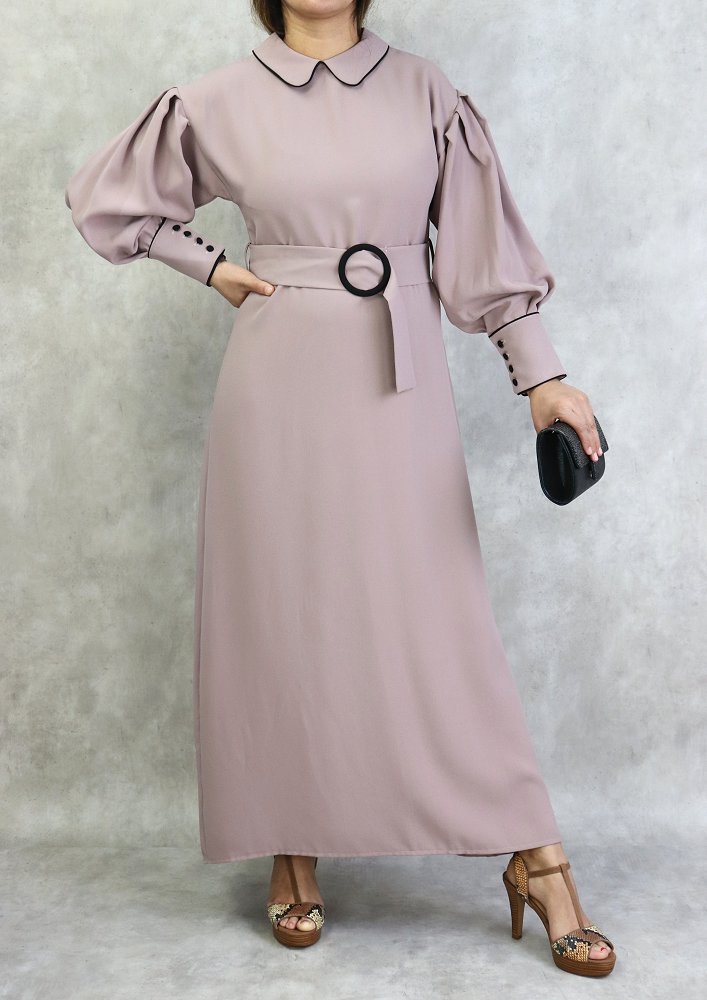 Cette robe est parfaite. Réalisée dans un tissu fluide, col claudine, fermeture éclair au dos, manches longues bouffante, une fantaisie de boutons aux poignets, taille resserrée par une ceinture coulissante. Boucle effet écaille.