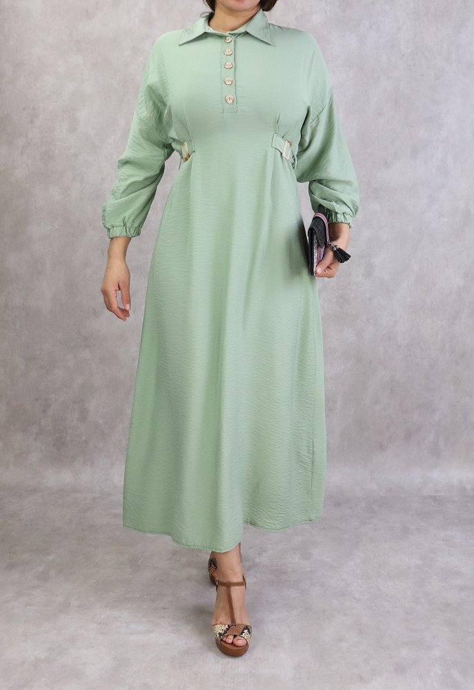 Robe longue col chemise, manches longues, poignets élastiques. Fermeture par haut boutonné, munie de deux lien sur les côté à la taille pour effet resserré.