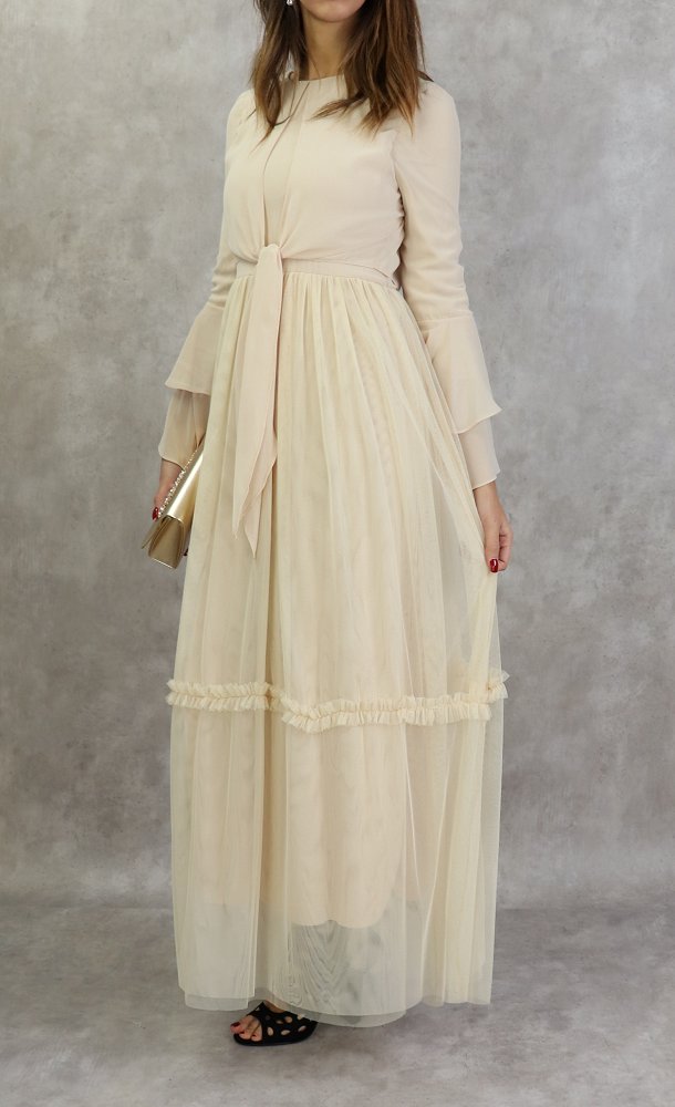 Robe longue, col rond, fermeture à glissière au dos, manches longues finition froufrous, effet boléro sur le buste, taille cintrée. Coupe évasée, tulle sur la moitié de la robe, entièrement doublée.