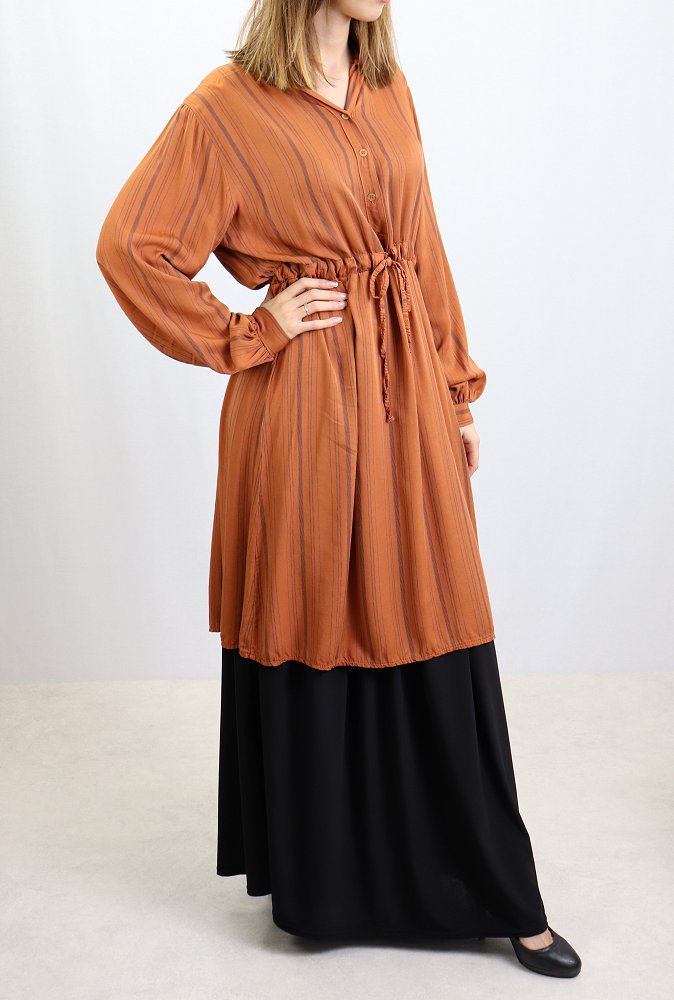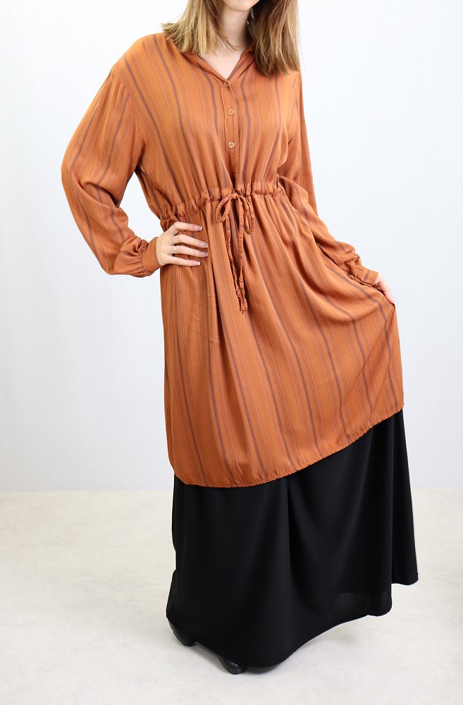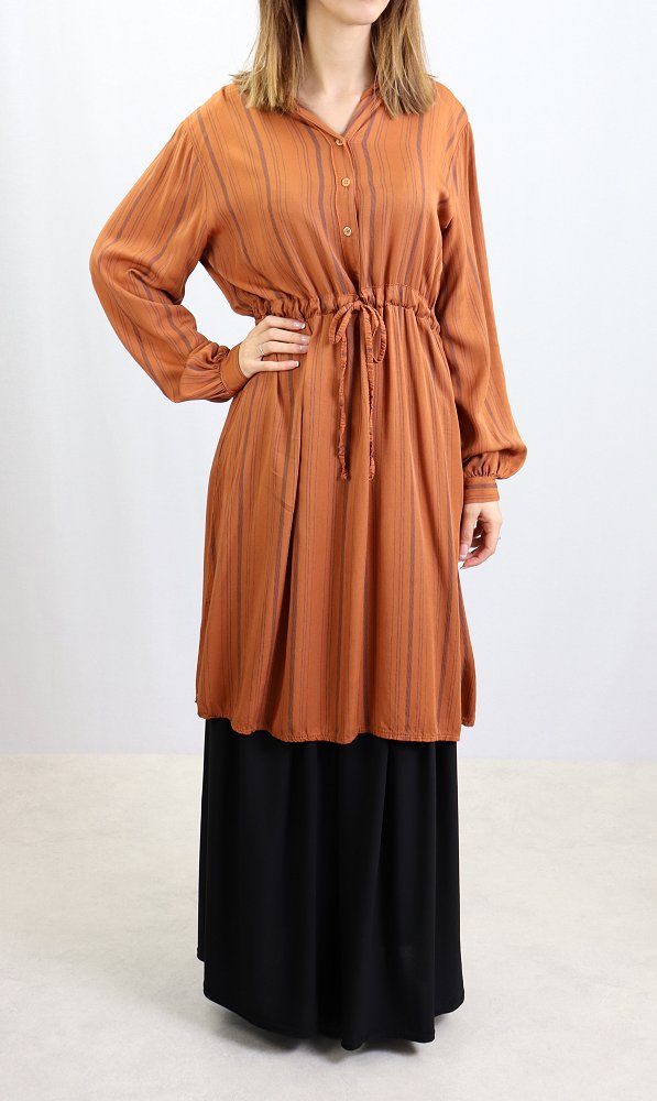 Tunique ample à manches longues, col mao, élastique au dos avec un lien de serrage à la taille, son tissu doux fluide.
