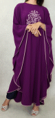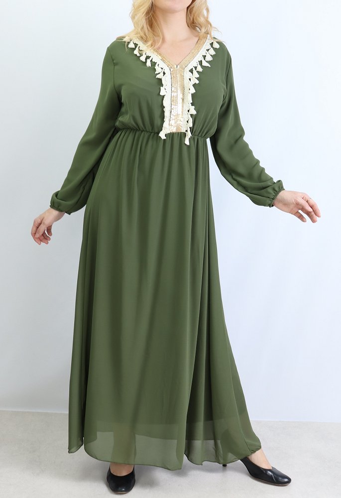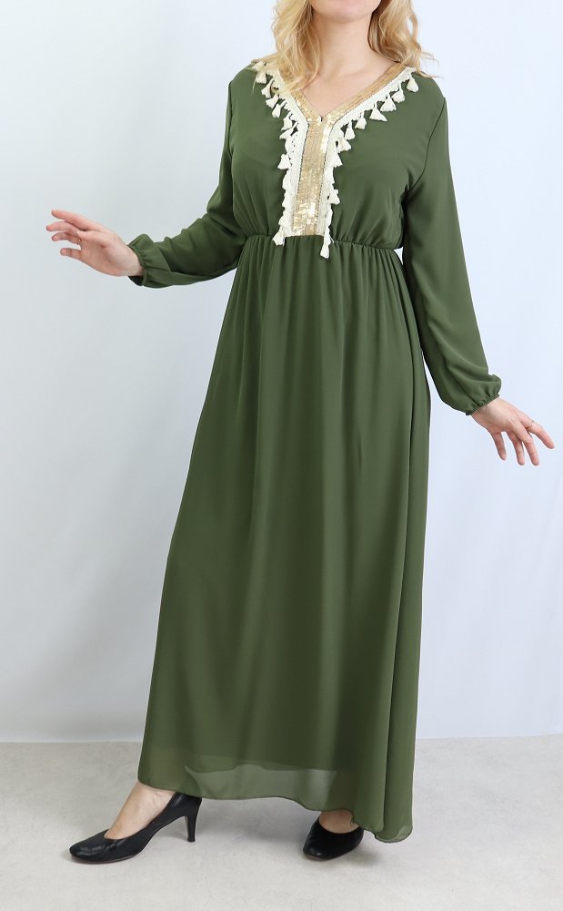 Très belle robe longue, entièrement doublée, col en V, ornée avec pompons et strass, taille élastiquée, manches longues poignets élastiques. Tissu de type mousseline.