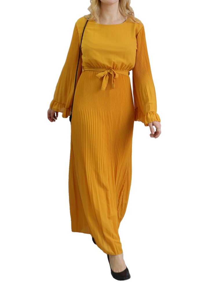 Robe longue ajustable à la taille. Plissée en bas de la robe ainsi que sur les manches évasées, le tout accompagné d'une ceinture qui peut se mettre autour ou par derrière. Intérieur doublé. Tissu de type mousseline.