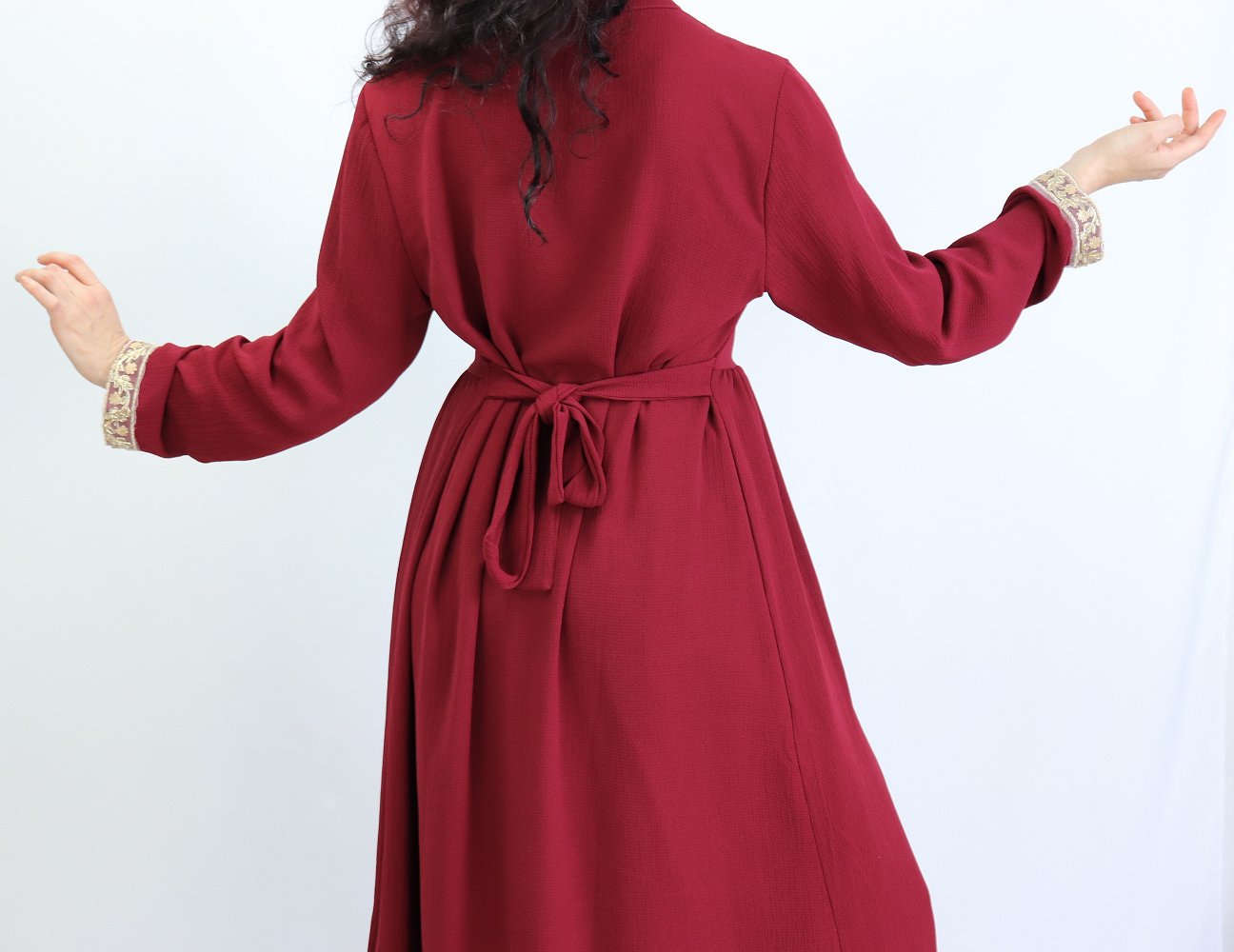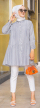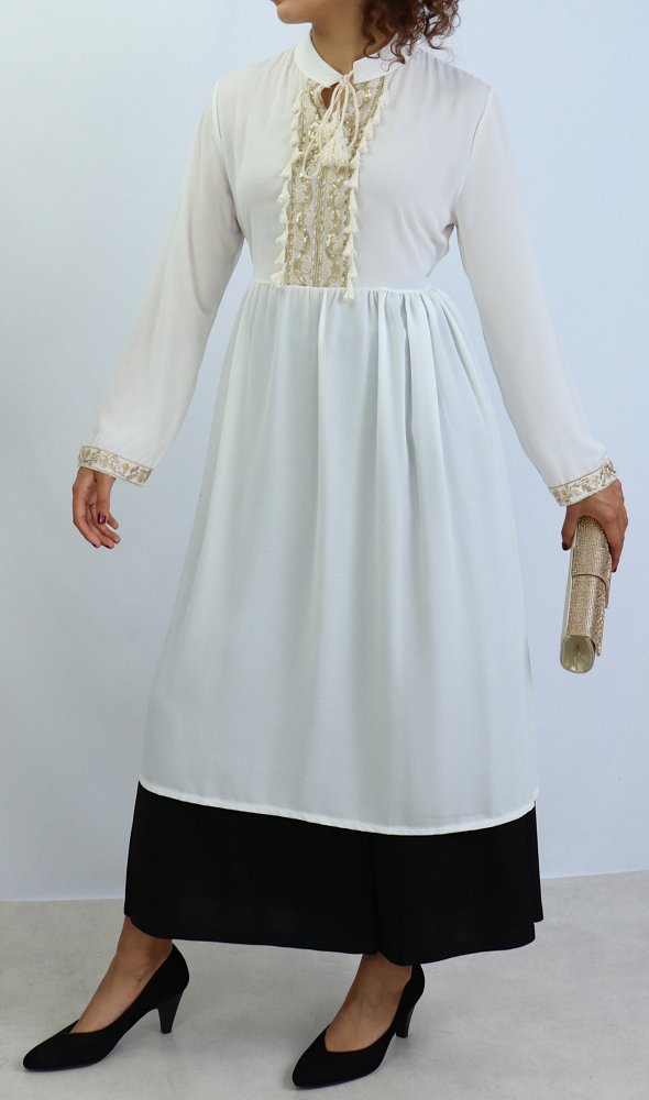 Tunique à pompons brodée et décorée, col rond doté de cordons, ceinture à 2 liens qui peuvent aussi bien se nouer à l’avant comme à l'arrière afin de faire un effet cintré. Matière de type crêpe légère et agréable à porter.