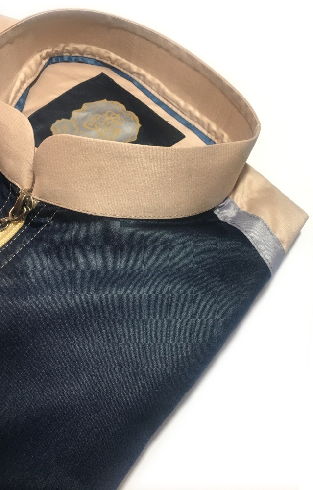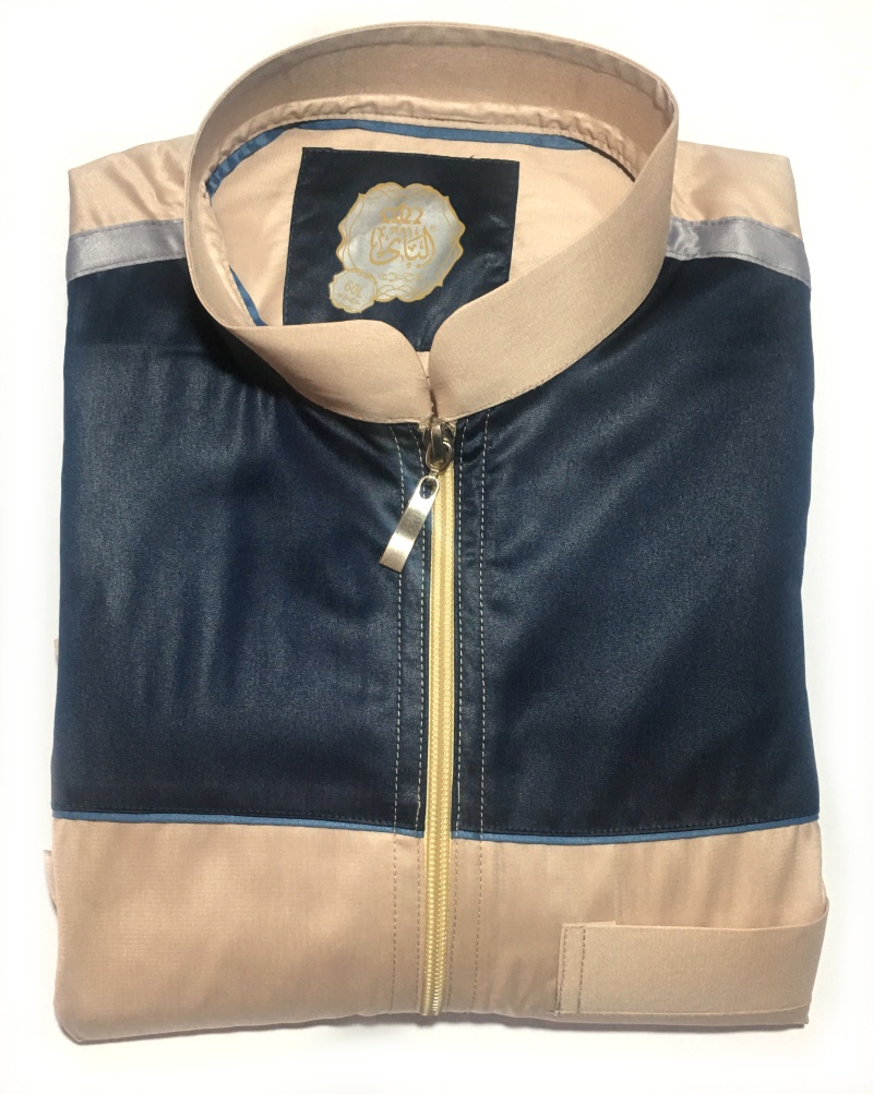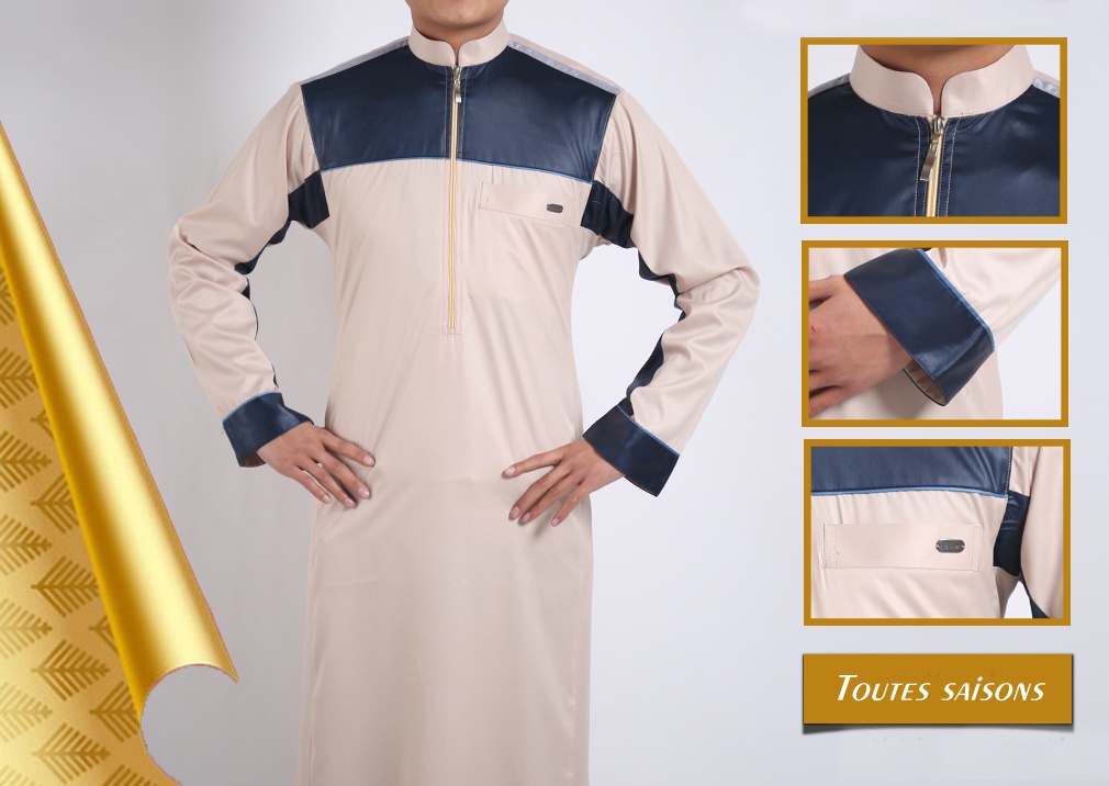 Qamis de couleur beige avec parties bleu marine au niveau de la poitrine et des poignets. Exactement comme sur les photos. Bande de couleur gris argenté au niveau des épaules.