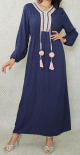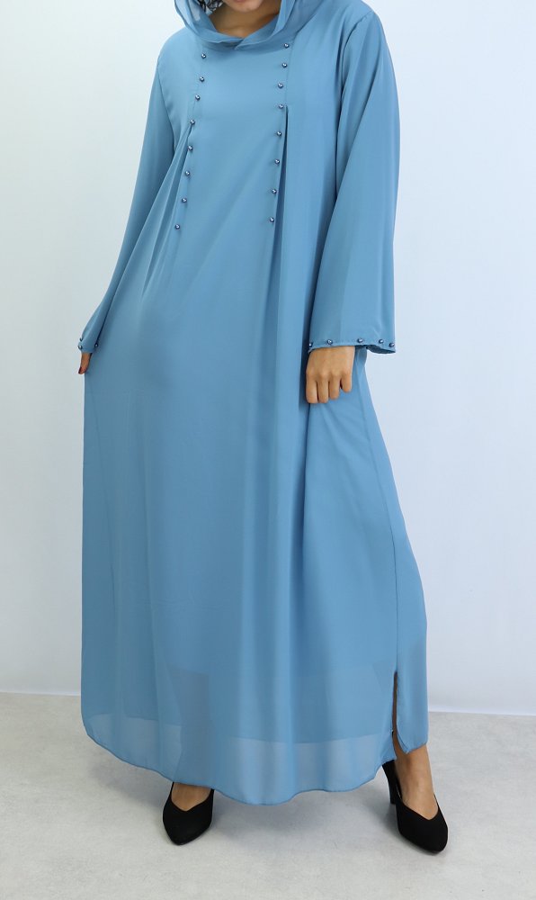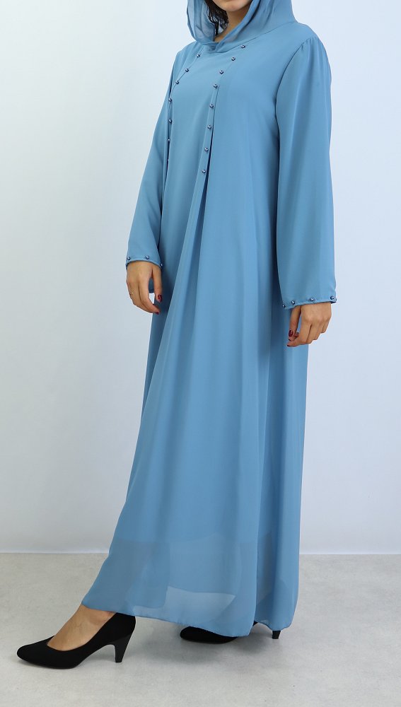 Robe longue, col capuche, entièrement doublée, manches longues, orné des perles sur le devant ainsi que les poignets. Sobre et élégant, Cette tenue s’accommode pour diverses occasions aussi bien festives que quotidiennes.