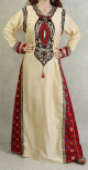 Robe longue, col rond, fermeture glissière au dos, manches longues finition élastique et froufrous aux poignets, taille cintrée ornée d'un ruban satiné. Coupe évasée vers la bas, entièrement doublée.