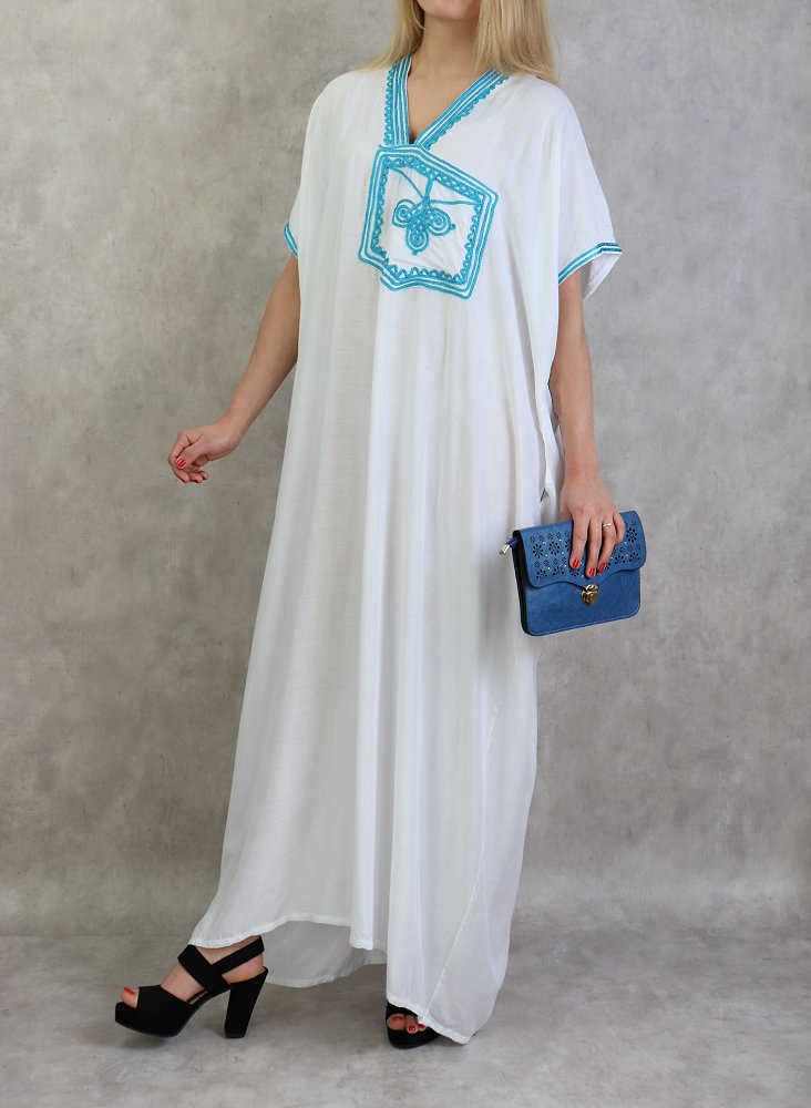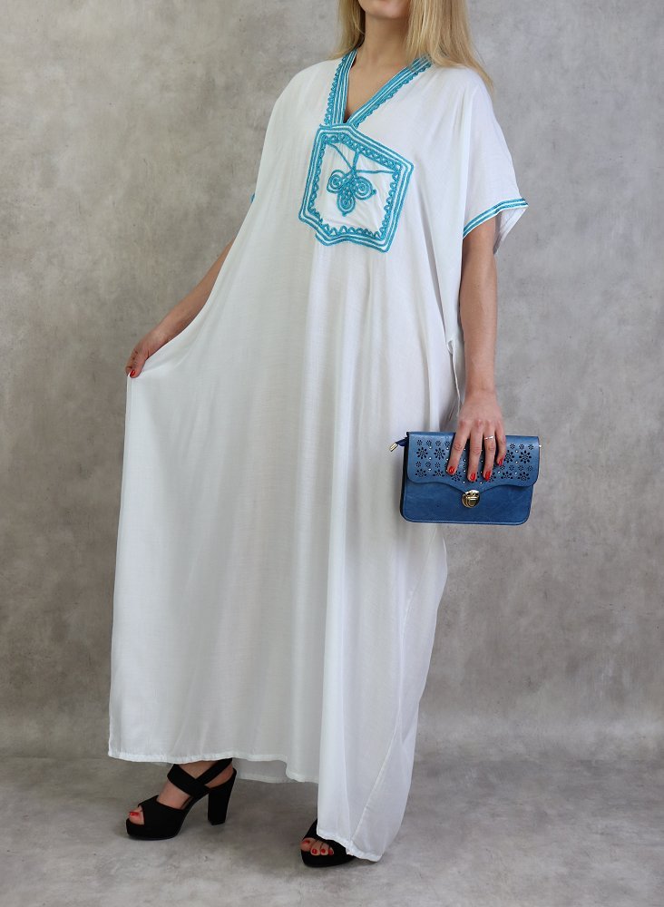 Gandoura marocaine de couleur blanche avec brodure bleue ciel et grande poche au niveau du cole - REF. 1927125,00 €