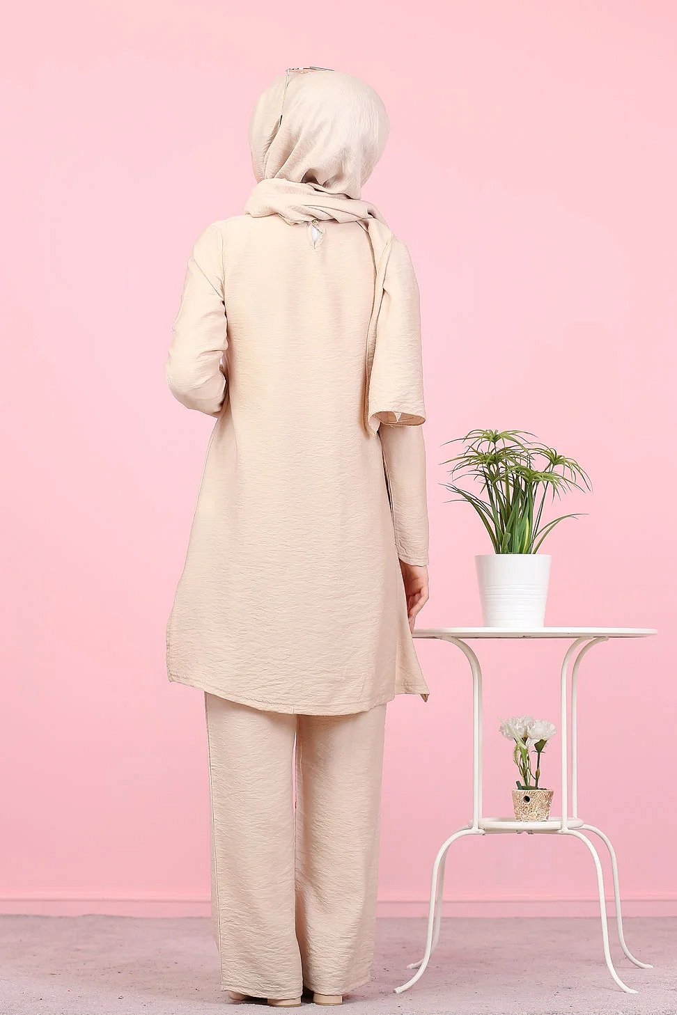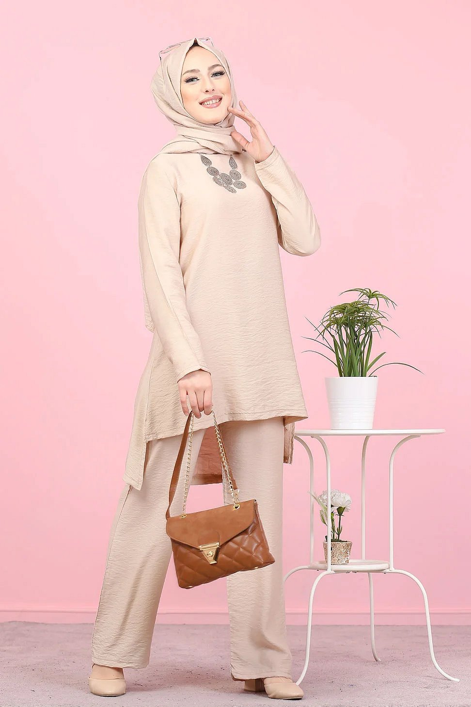 Un ensemble pour femmes composé d’une longue tunique et pantalon ainsi que d’un magnifique châle assorti.