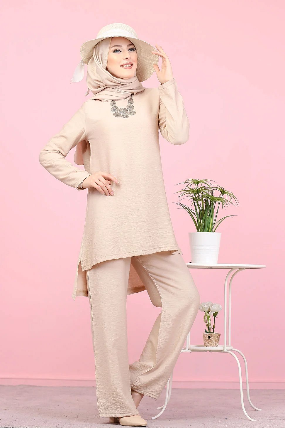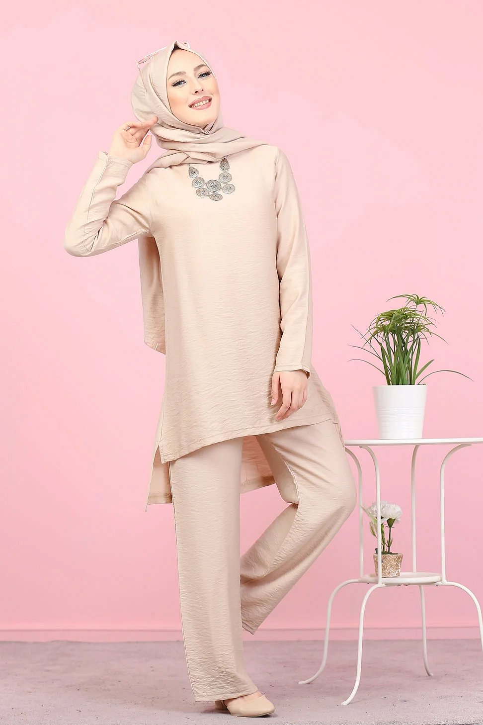Sa m’aille fluide lui assure un tombé impeccable tout en allongeant votre silhouette... C’est l’atout mode de votre garde-robe ! Encolure ronde avec fermeture bouton à l’arrière. Pantalon coupe droite taille élastique.