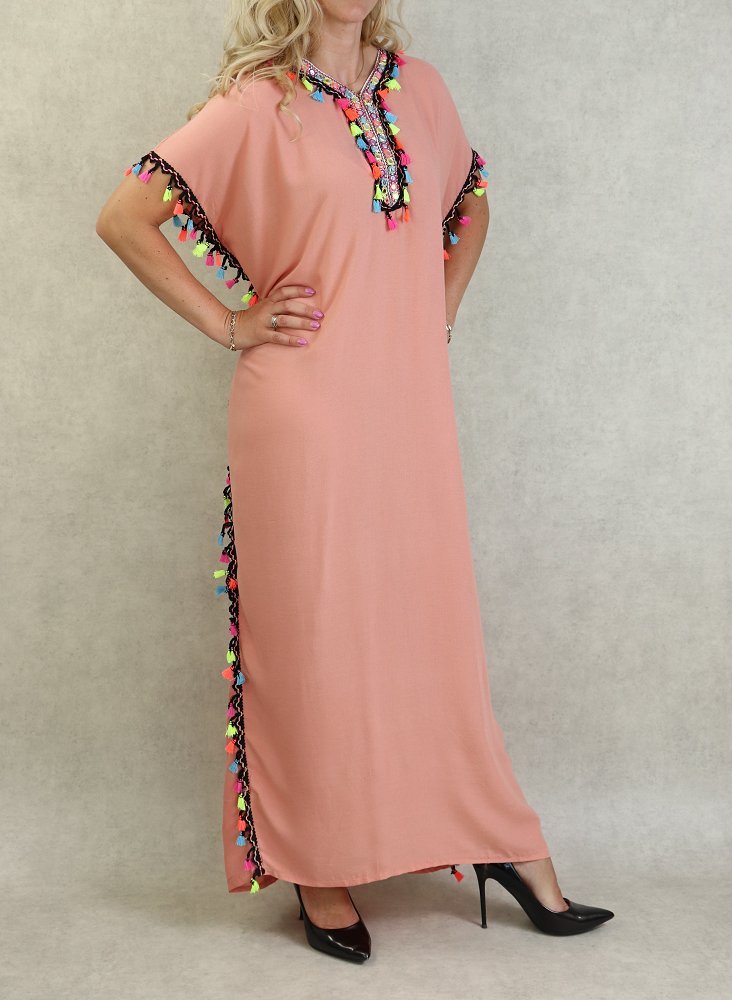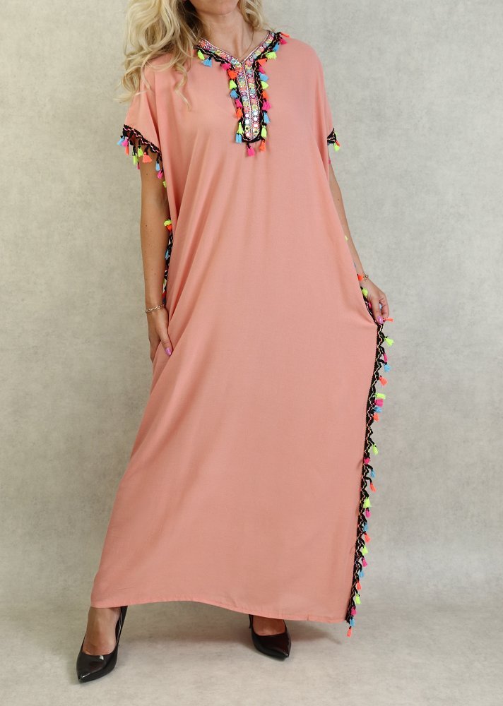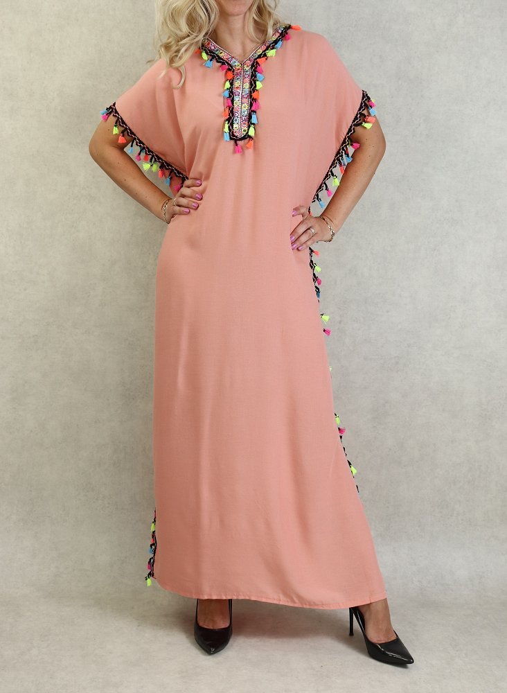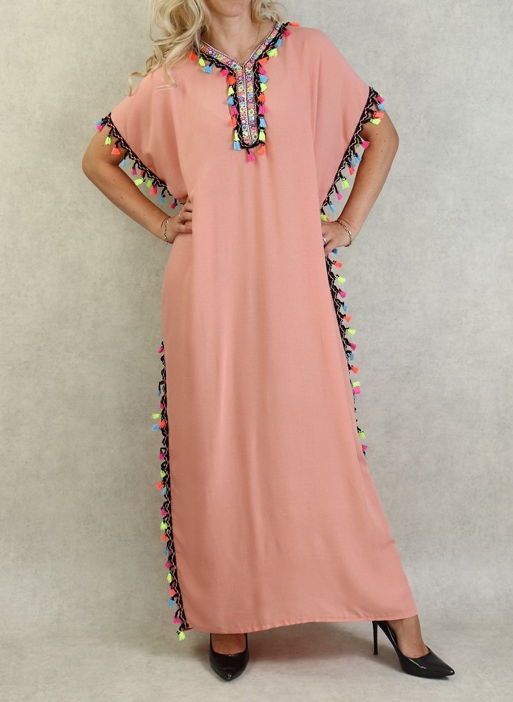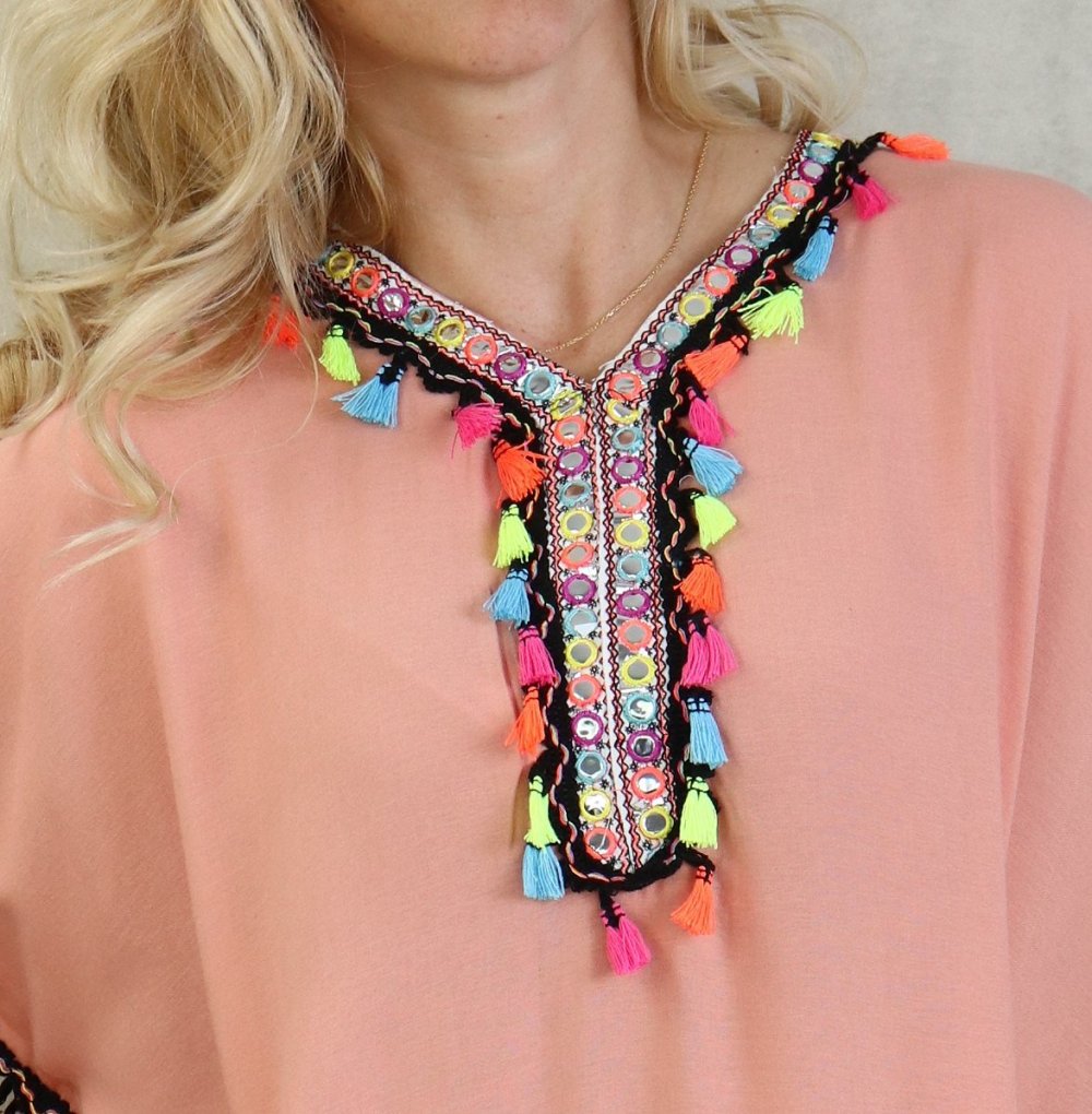 Robe orientale avec broderies et pompons, coupe droite, col rond semi ouvert, sans manches. La coupe ainsi que sa matière faciliteront une décontraction évidente.