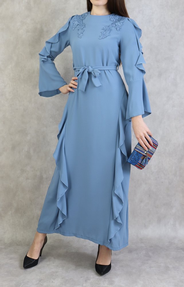 Robe longue, col rond, fermeture éclair au dos, broderies sur les épaules, manches longues, poignets évasés, ceinture assortie à passants. Coupe droite, tissu fluide et opaque, finitions froufrous sur les manches et la longueurs.