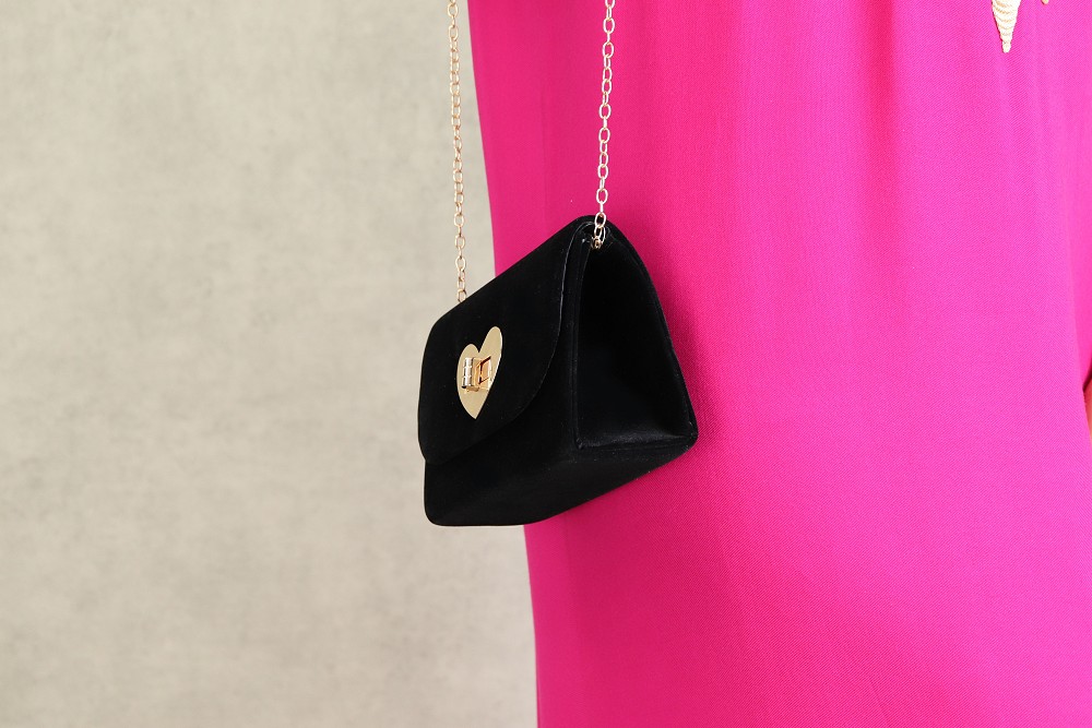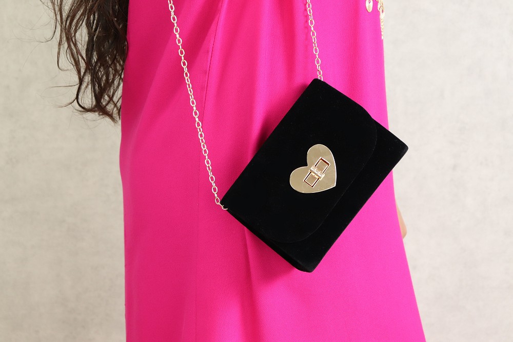 Comment ne pas craquer au vue de cette pochette de soirée effet velours. Sa petite taille est bien pratique ! Ce modèle dispose d'une bandoulière amovible à ranger l'intérieur (chaînette dorée très féminine). Fermeture incrustée dans un coeur métallique doré. Le volume intérieur est suffisamment grand (pour y ranger ses clés et son portable)...