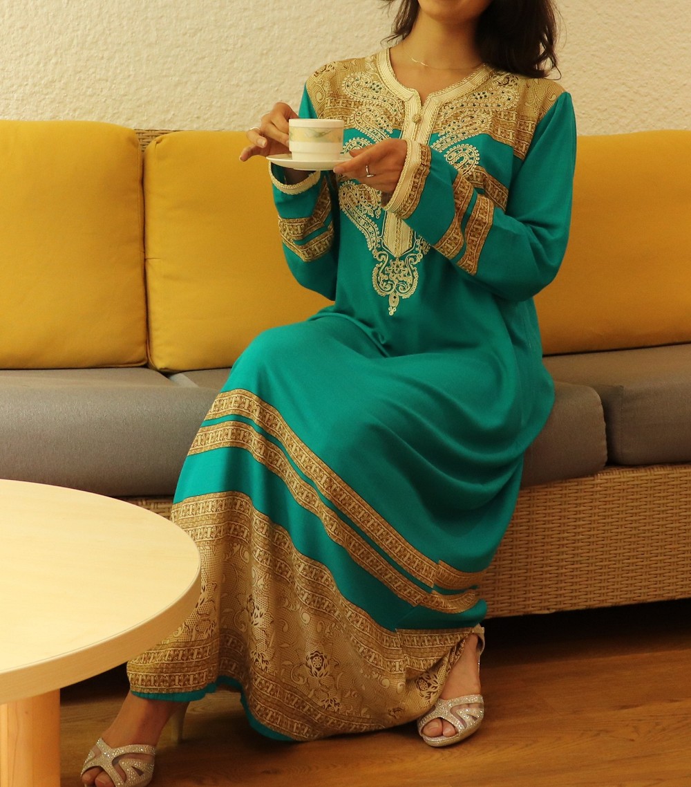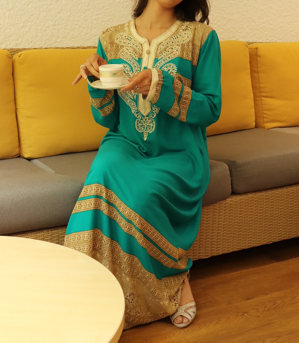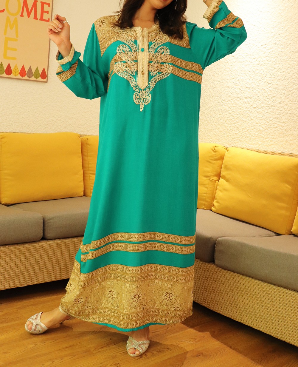 Robe orientale longue d'été ou d'intérieur bi-couleur, manches longues, col rond, orné de broderies et strass sur le buste et les poignets. Cette robe est dotée d'une magnifique tissu opaque, fluide avec un imprimé original.