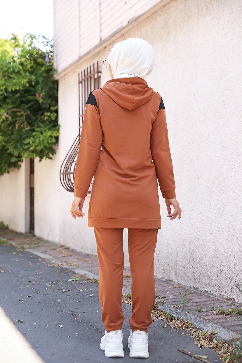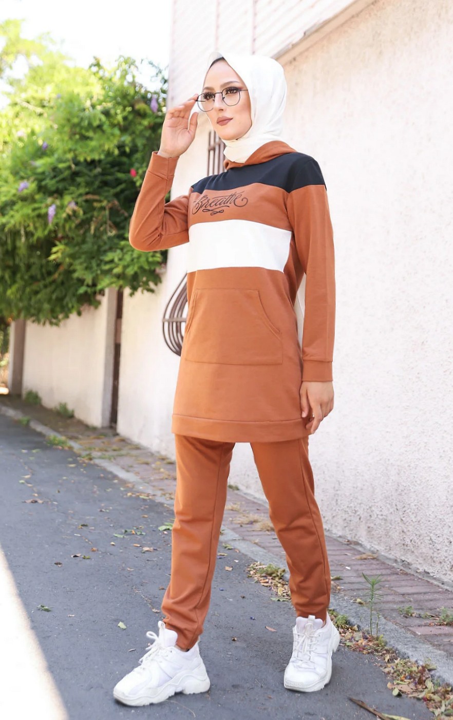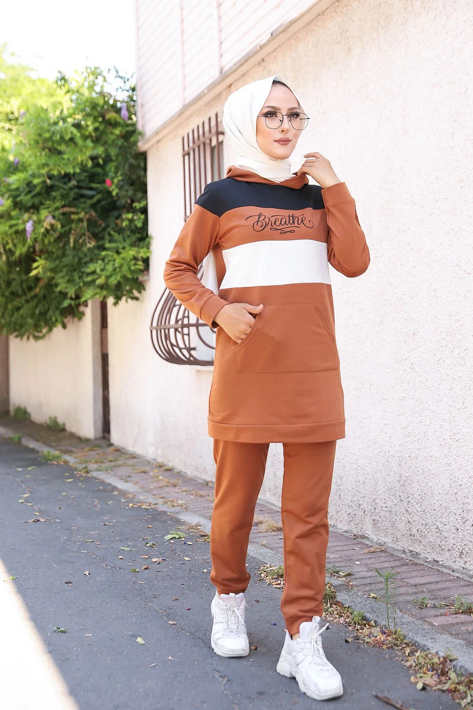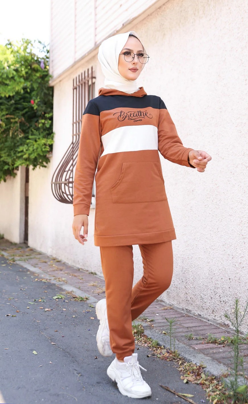 Ensemble sport deux pièces (haut et bas assortis) avec grandes poches et capuche, parfait pour le quotidien ou vos activités sportives. On aime sa coupe tendance pensée pour les femmes actives. Conçu dans une matière coton très qualitative. Imprimé avec le verbe anglais "Breathe" qui signifie "Respirer".