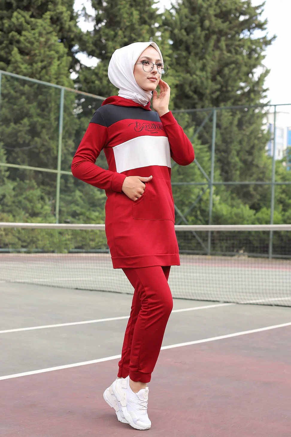 Survêtement tricolore à capuche imprimé "Breathe" (Sportwear femme voilée) - Couleur Bordeaux, noir et blanc Vetement & Accessoire