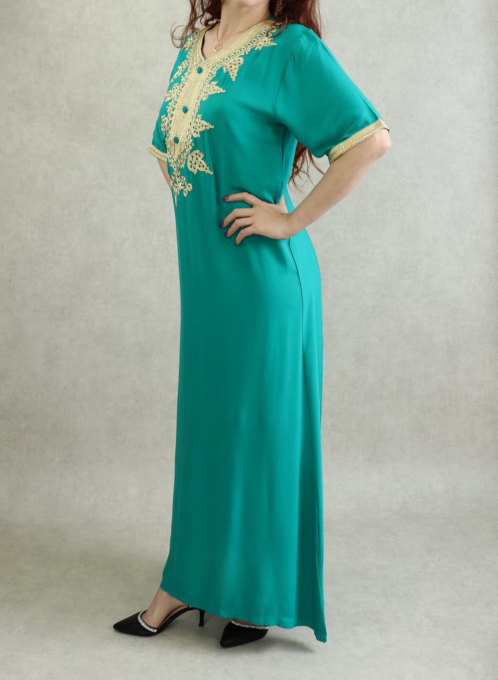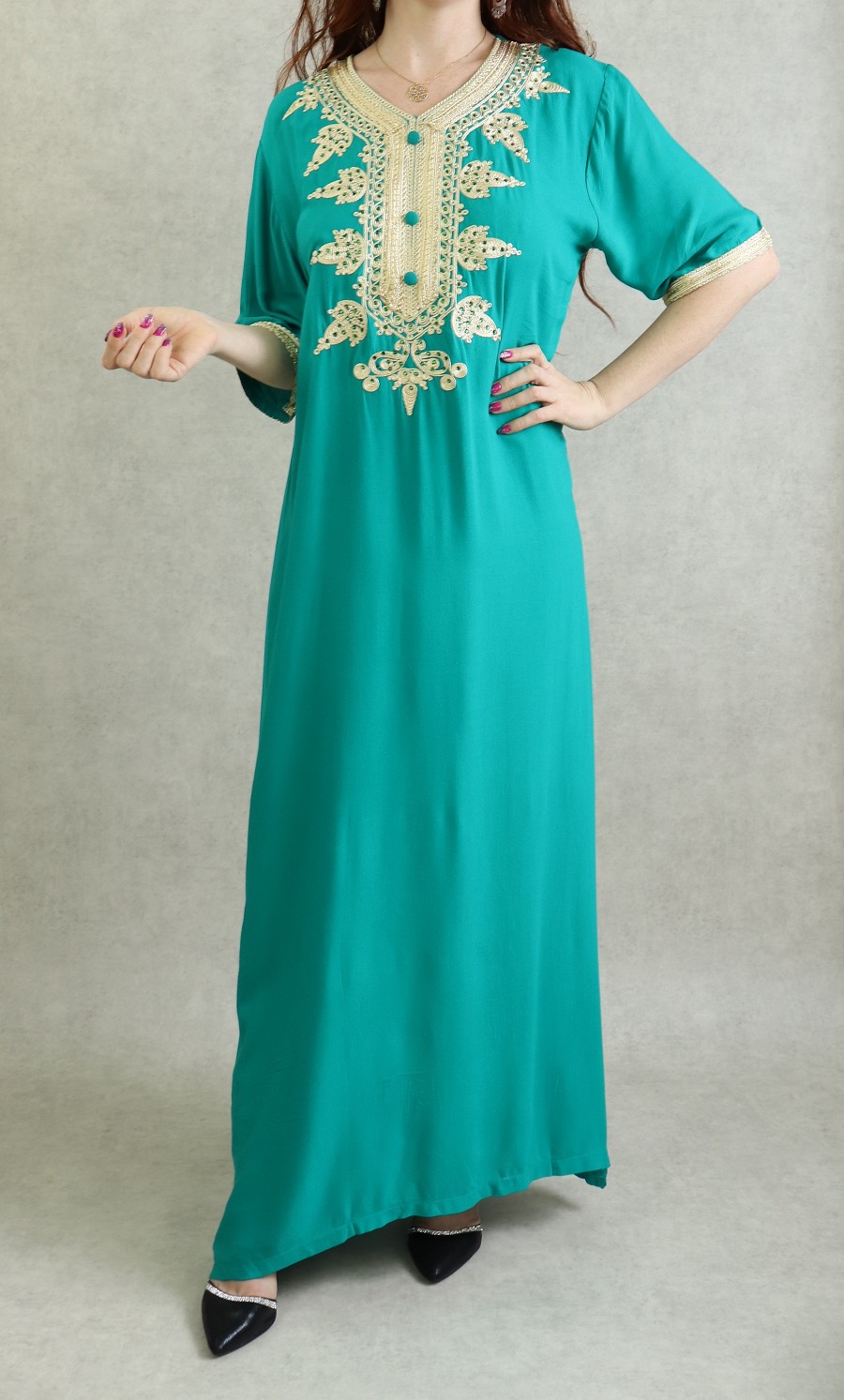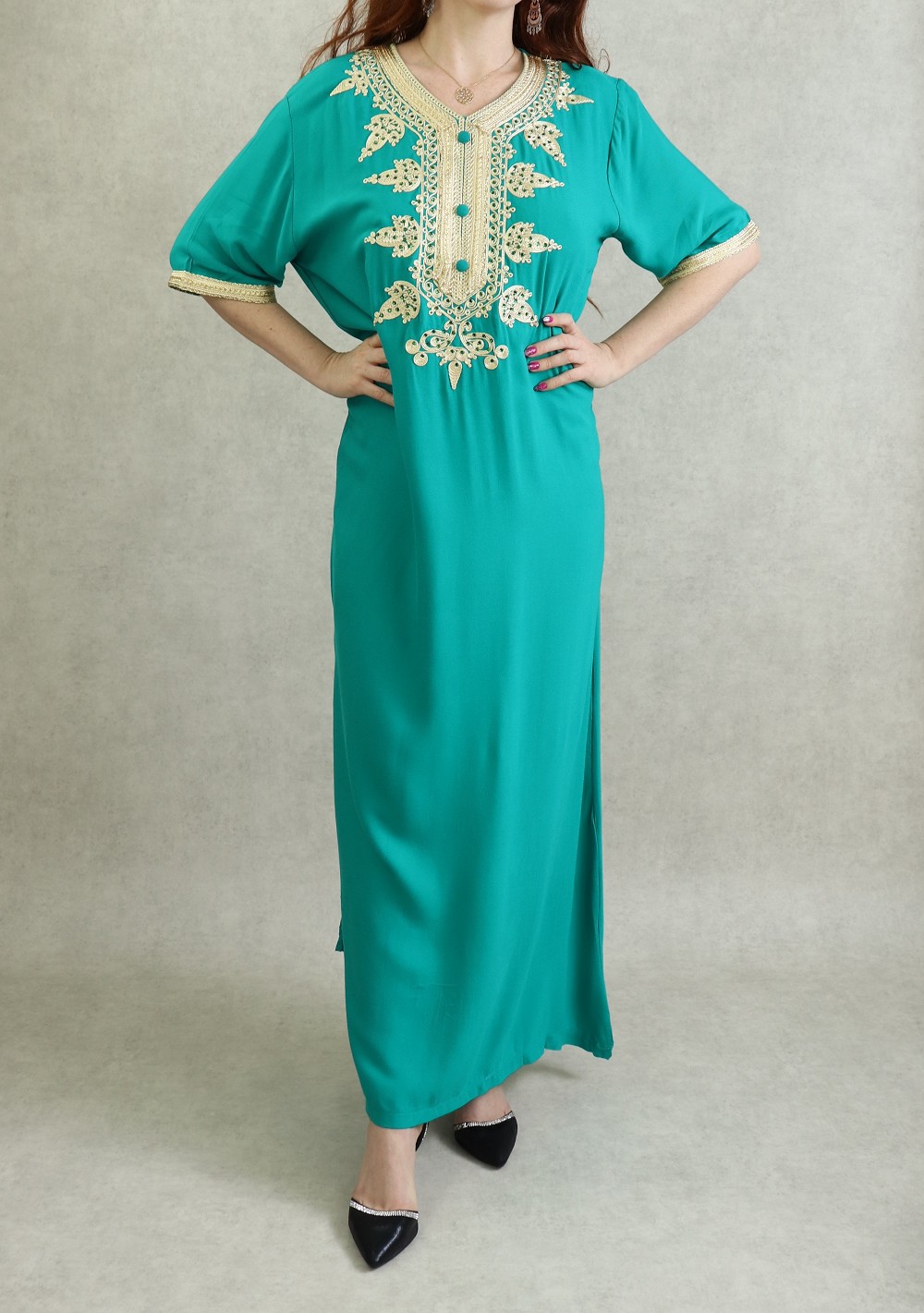 Très Belle robe algérienne. Robe longue manches courtes et broderies dorées sur le col et les manches, accompagnés de quelques strass.