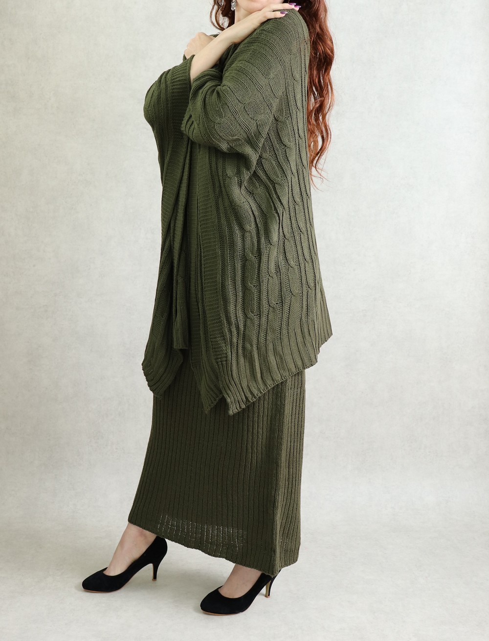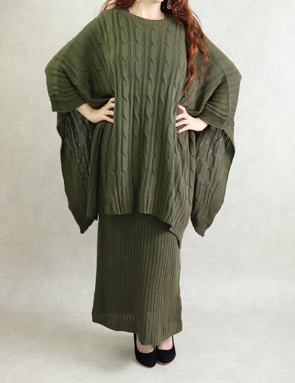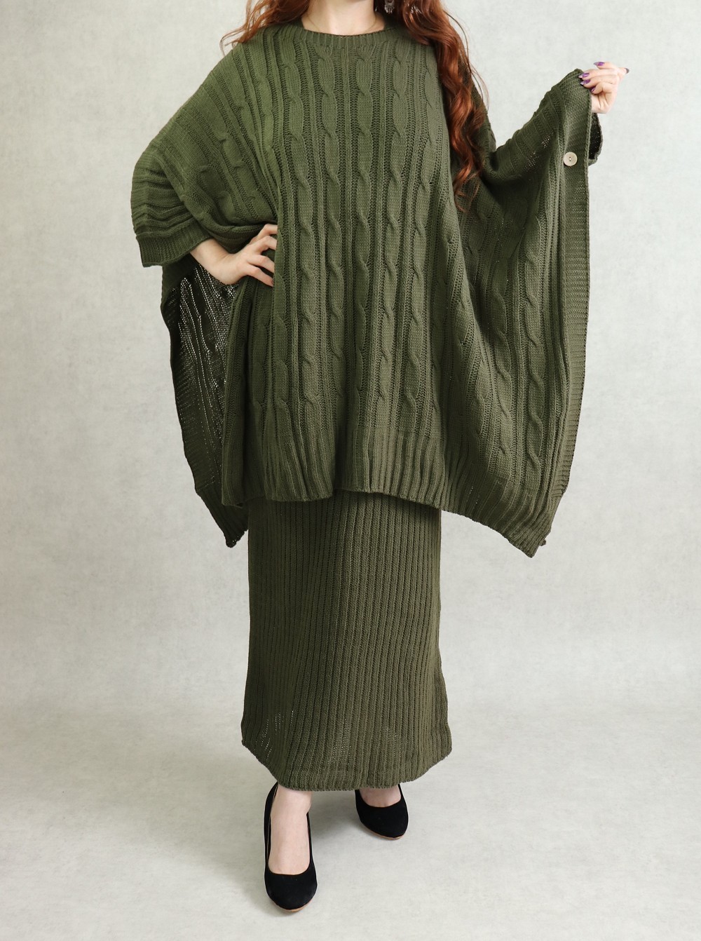Ensemble robe débardeur, col en V, coupe droite, grosse maille + pull poncho, coupe large, boutons décoratifs au niveau des manches coupées, maille torsadée.