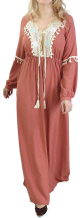Robe longue, col rond, fermeture glissière au dos, manches longues finition élastique et froufrous aux poignets, taille cintrée ornée d'un ruban satiné. Coupe évasée vers la bas, entièrement doublée.