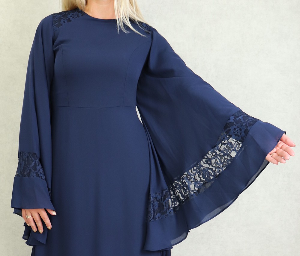Robe longue, col rond, glissière au dos, manches longues style kimono, taille cintrée. Coupe évasée, tissu aéré et non transparent, entièrement doublée.