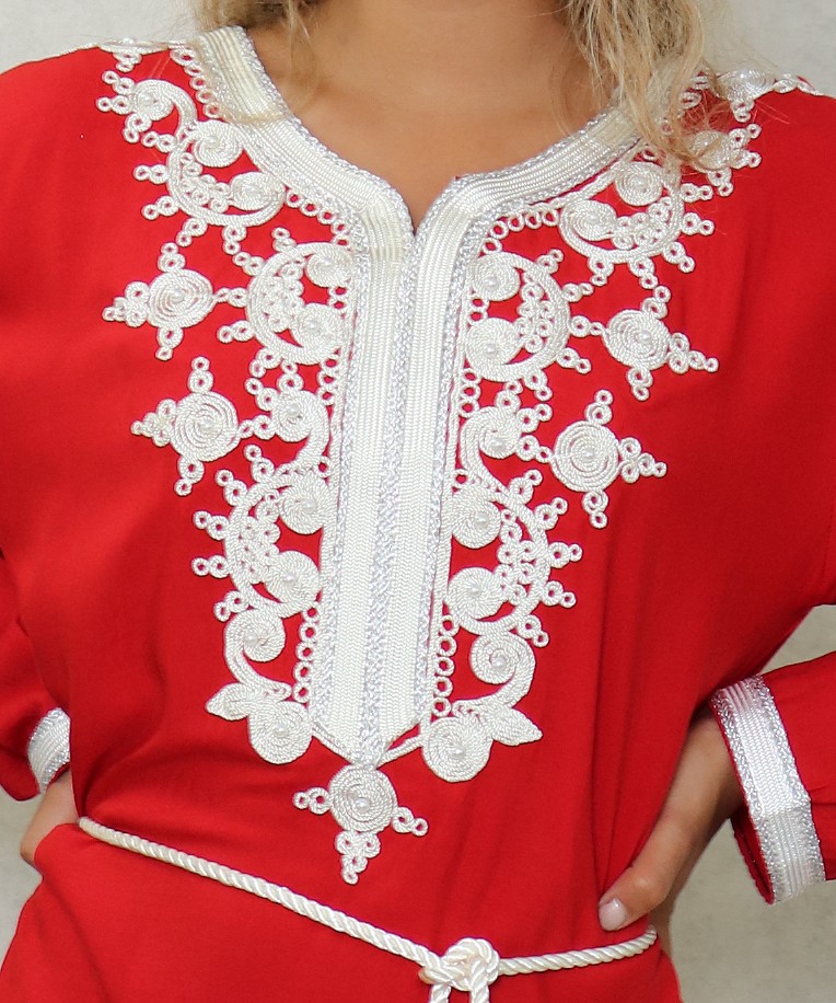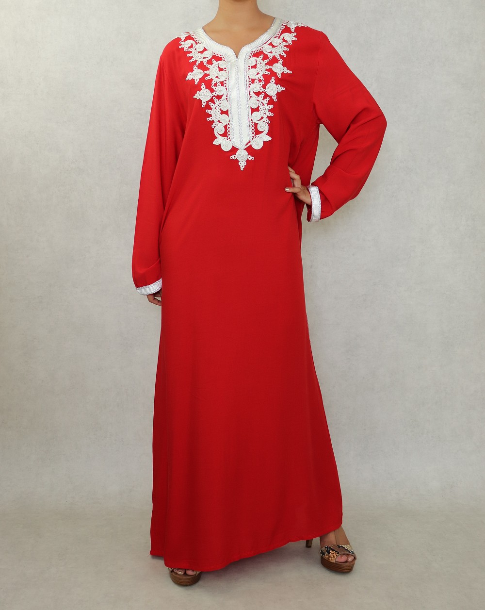 Robe longue, col en V, manches longues ornées de broderies sur les poignets ainsi que sur le buste. Coupe droite, tissu fluide et doux.