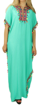 Robe orientale extra large avec broderies et pompons, coupe droite, col rond semi ouvert, sans manches. La coupe ainsi que sa matière faciliteront une décontraction évidente.