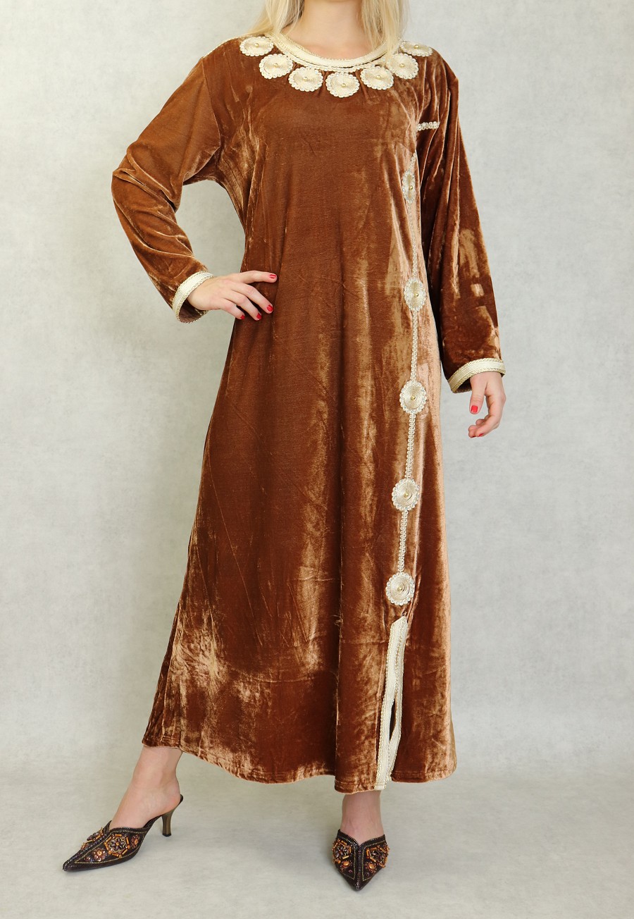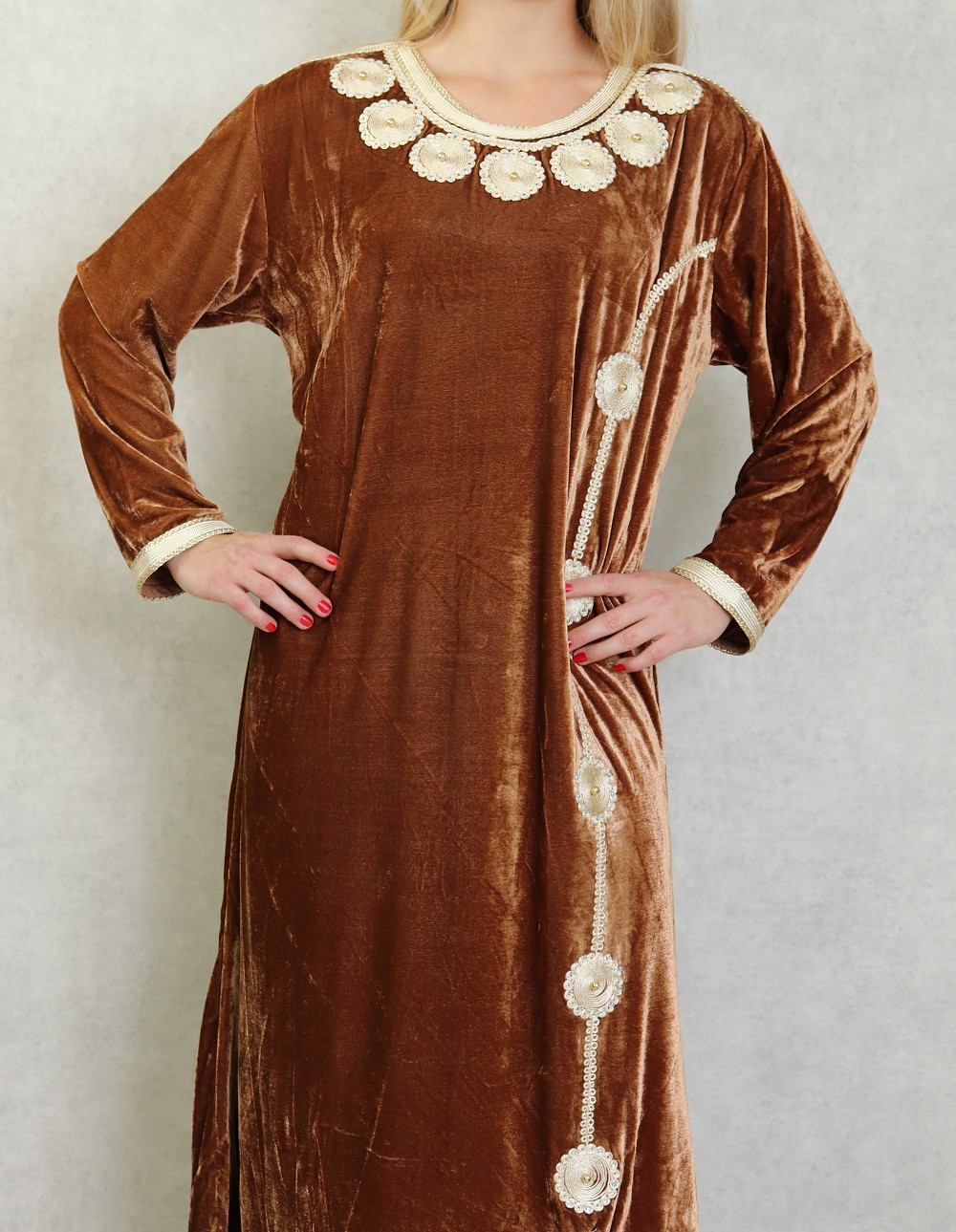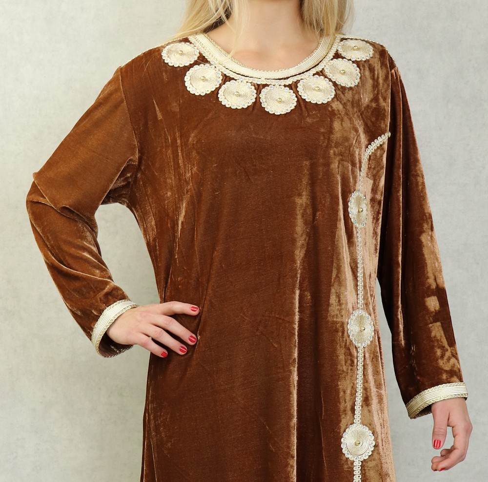 Belle robe en velours style oriental à manches longues avec broderies de qualité sur l'encolure et toute la longueur. Tenue sobre et élégante, parfaite pour occasions et événements.