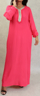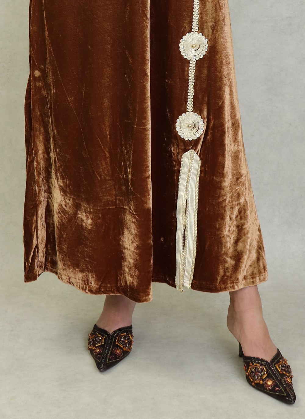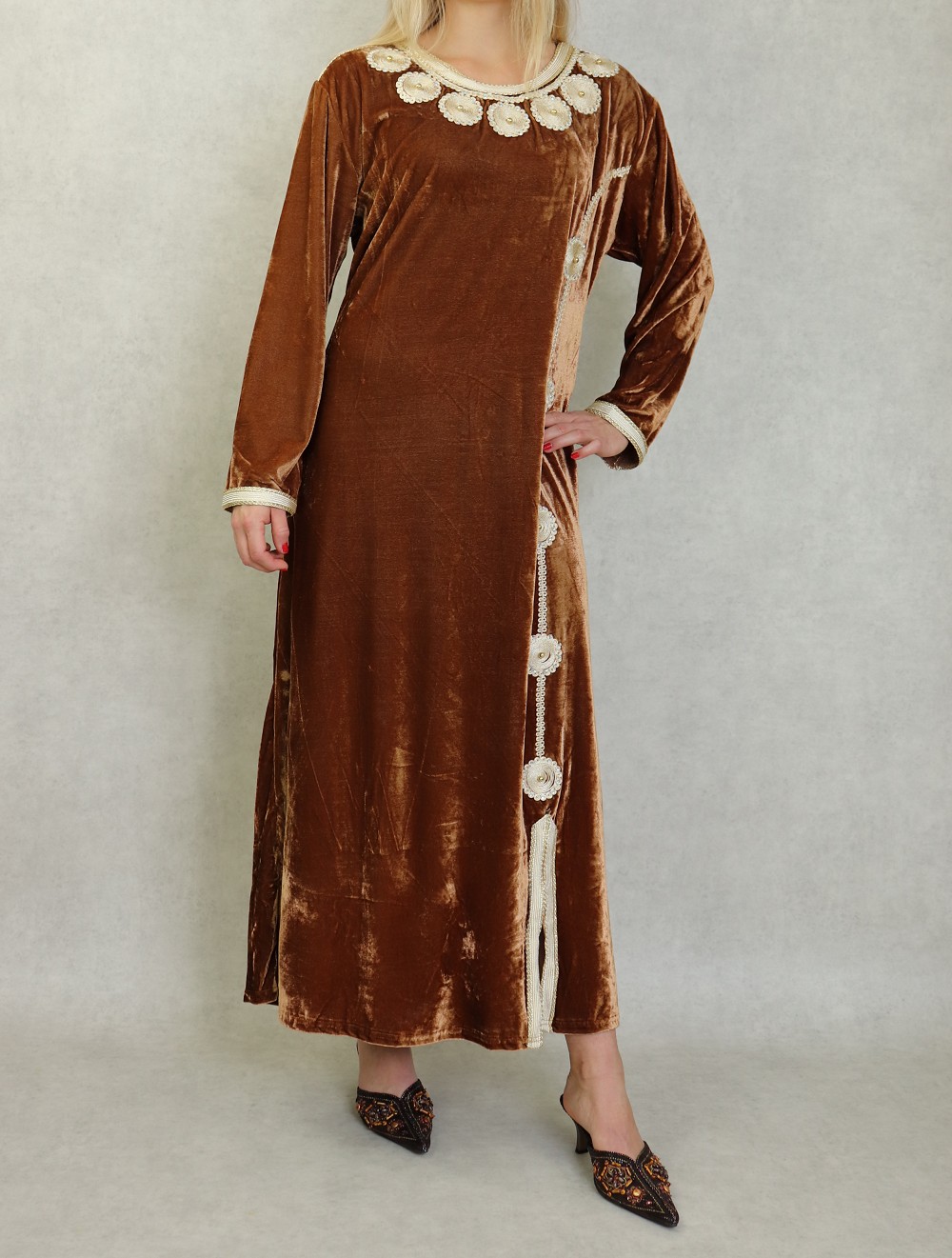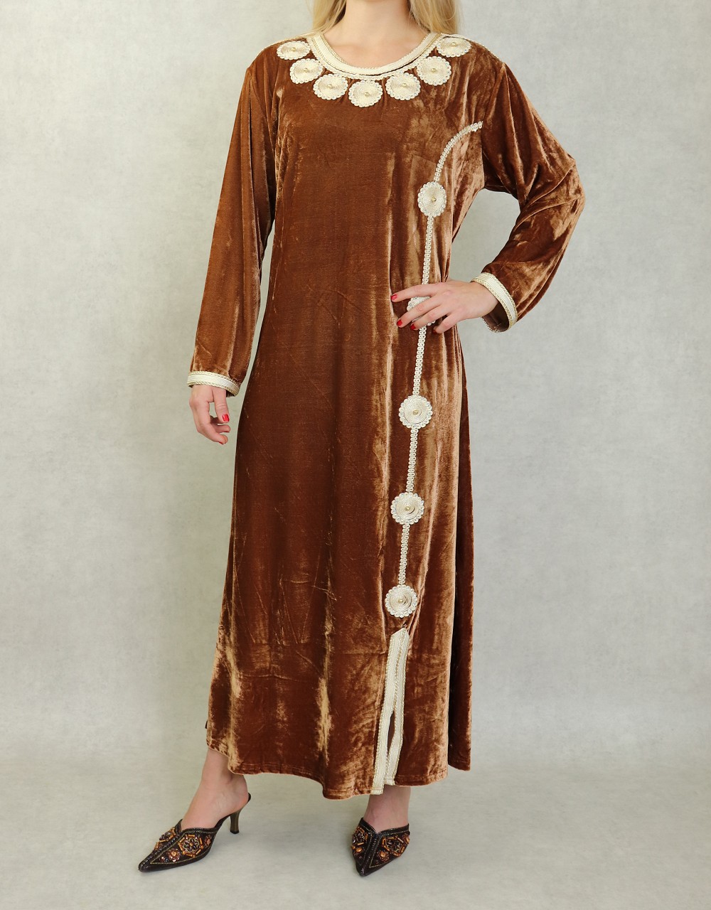 Belle robe en velours style oriental à manches longues avec broderies de qualité sur l'encolure et toute la longueur. Tenue sobre et élégante, parfaite pour occasions et événements.