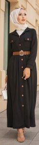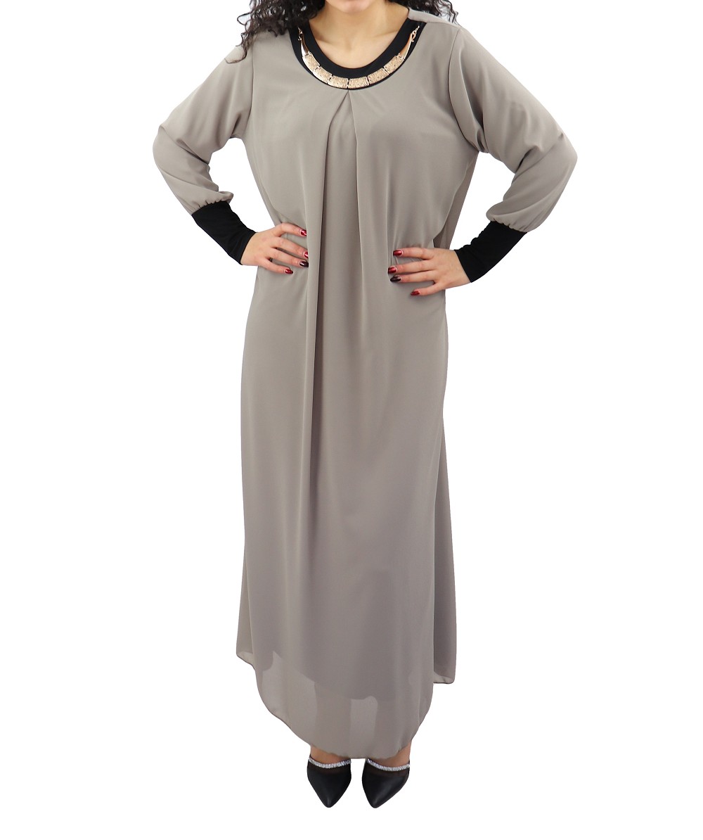Robe longue, col rond avec un joli collier intégré, entièrement doublée, manches longues, resserrées aux poignets par une bande large élastique. Sobre et élégant, Cette tenue s’accommode pour diverses occasions aussi bien festives que quotidiennes.