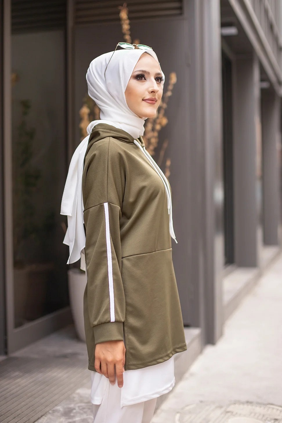 Tunique longue à rayures avec capuche (Vêtement moderne et sport pour hijab) - Couleur vert kaki - REF. 35739 (19.00 €)