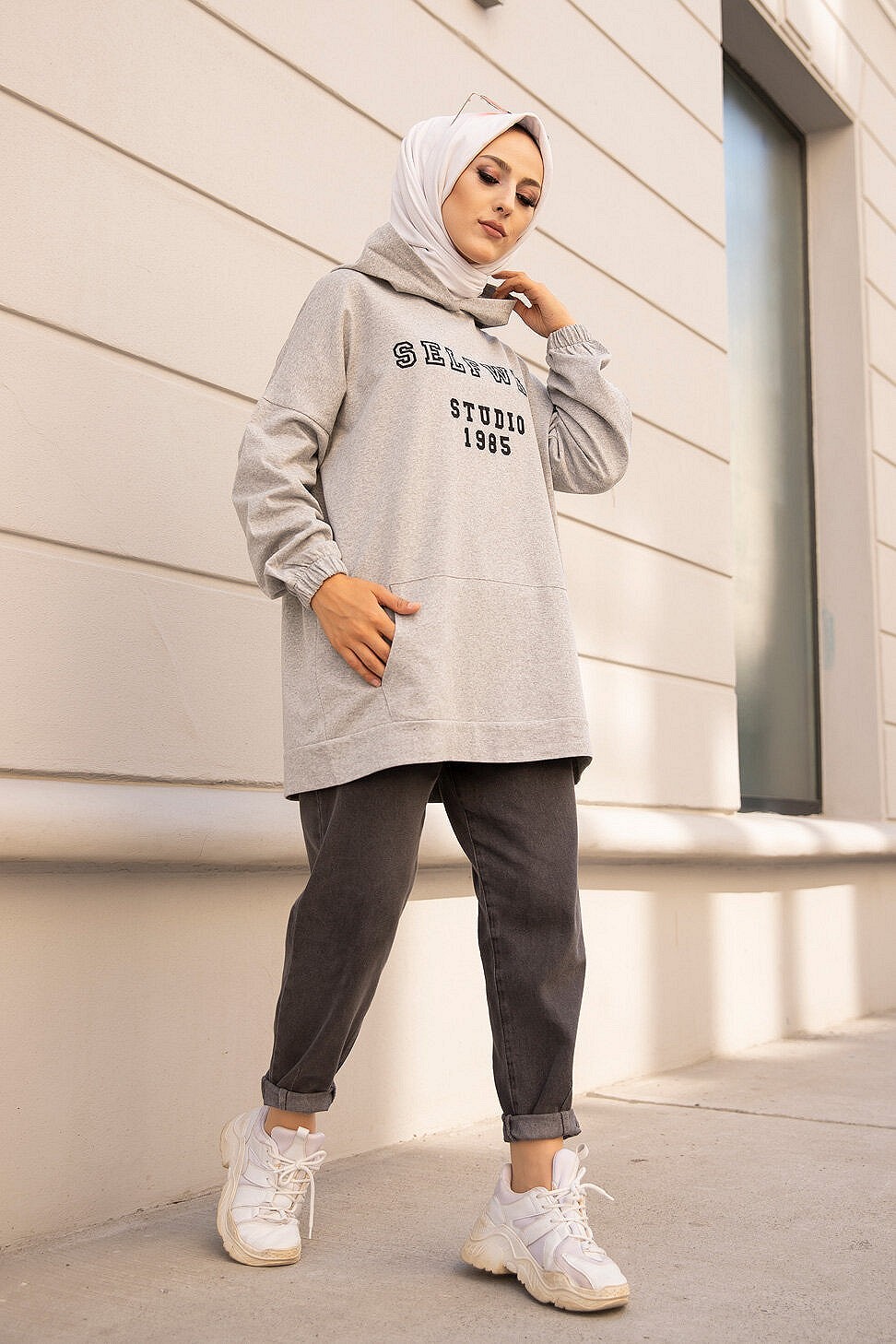 Tunique avec capuche imprimé "Like a cute baby" (Tenue Moderne Hijab) - Couleur gris clair - REF. 37726 (26.00 €) - En Promotion à 19.90 €