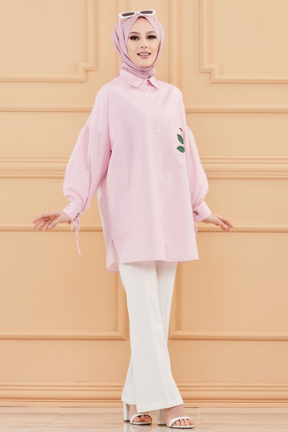 Chemise-Tunique motif fleur (Vetement pour femme voilee) - Couleur des rayures : rose clair