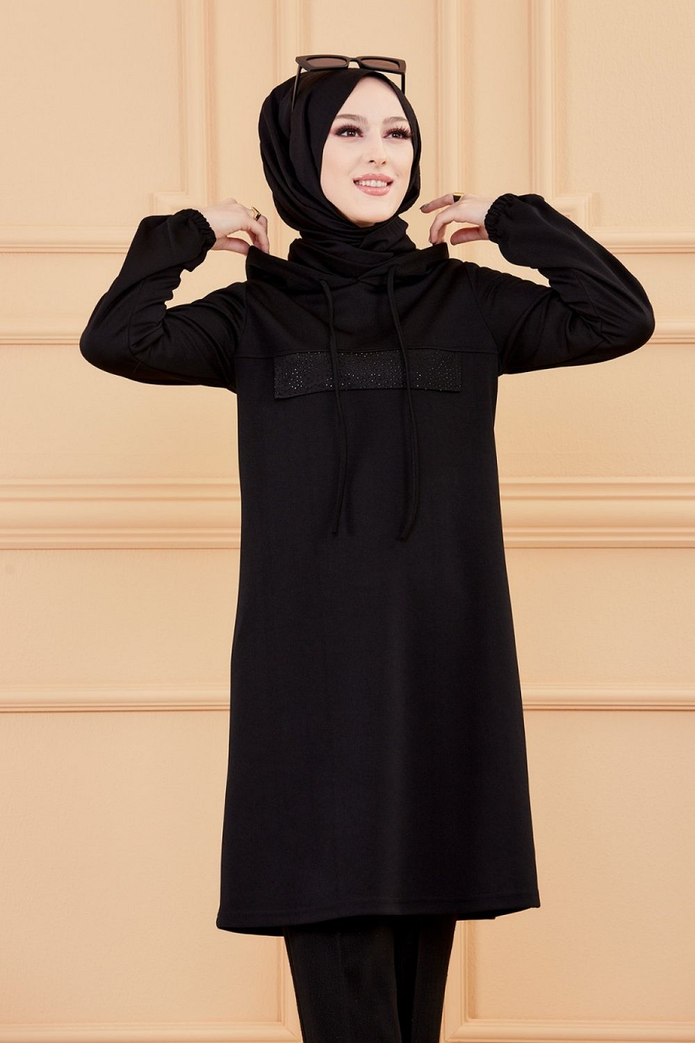 Tunique avec strass et capuche (Vêtement décontracté moderne pour hijab) - Couleur noir Vetement & Accessoire