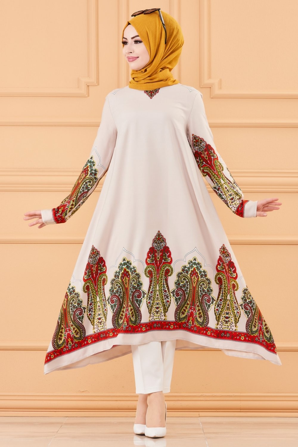 Tunique motifs fleurs et arabesques pour femme (Vêtement Hijab Chic) - Couleur vison - REF. 37138 (19.90 €)